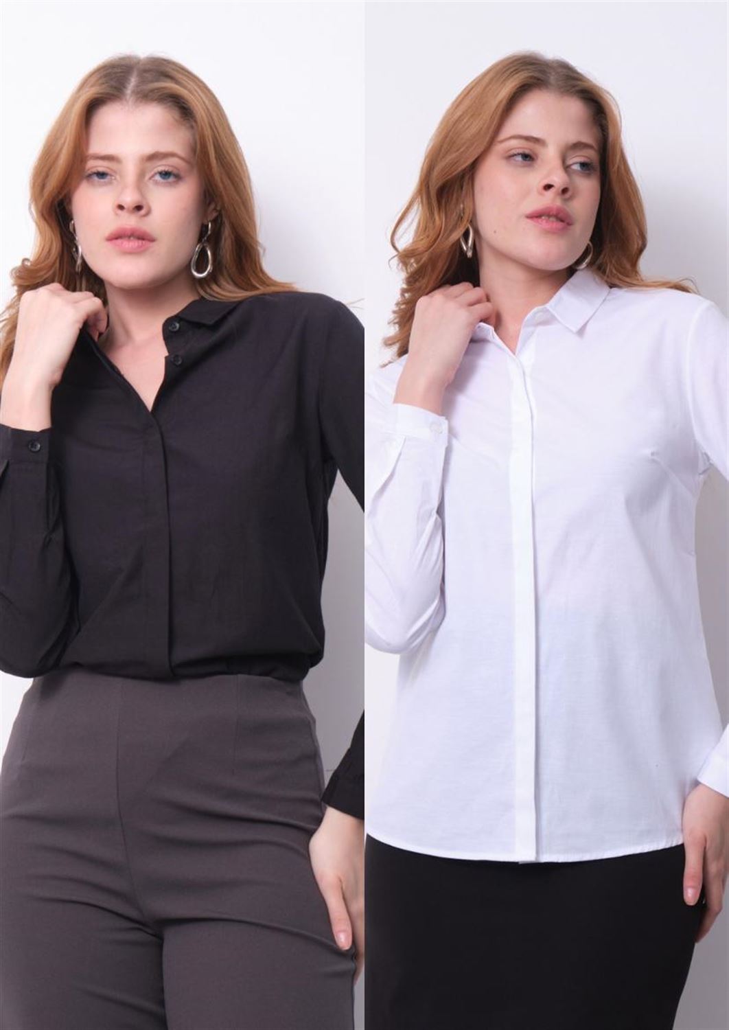 2'li Klasik Basic Kesim Gizli Düğmeli Personel Ofis Kadın Gömleği