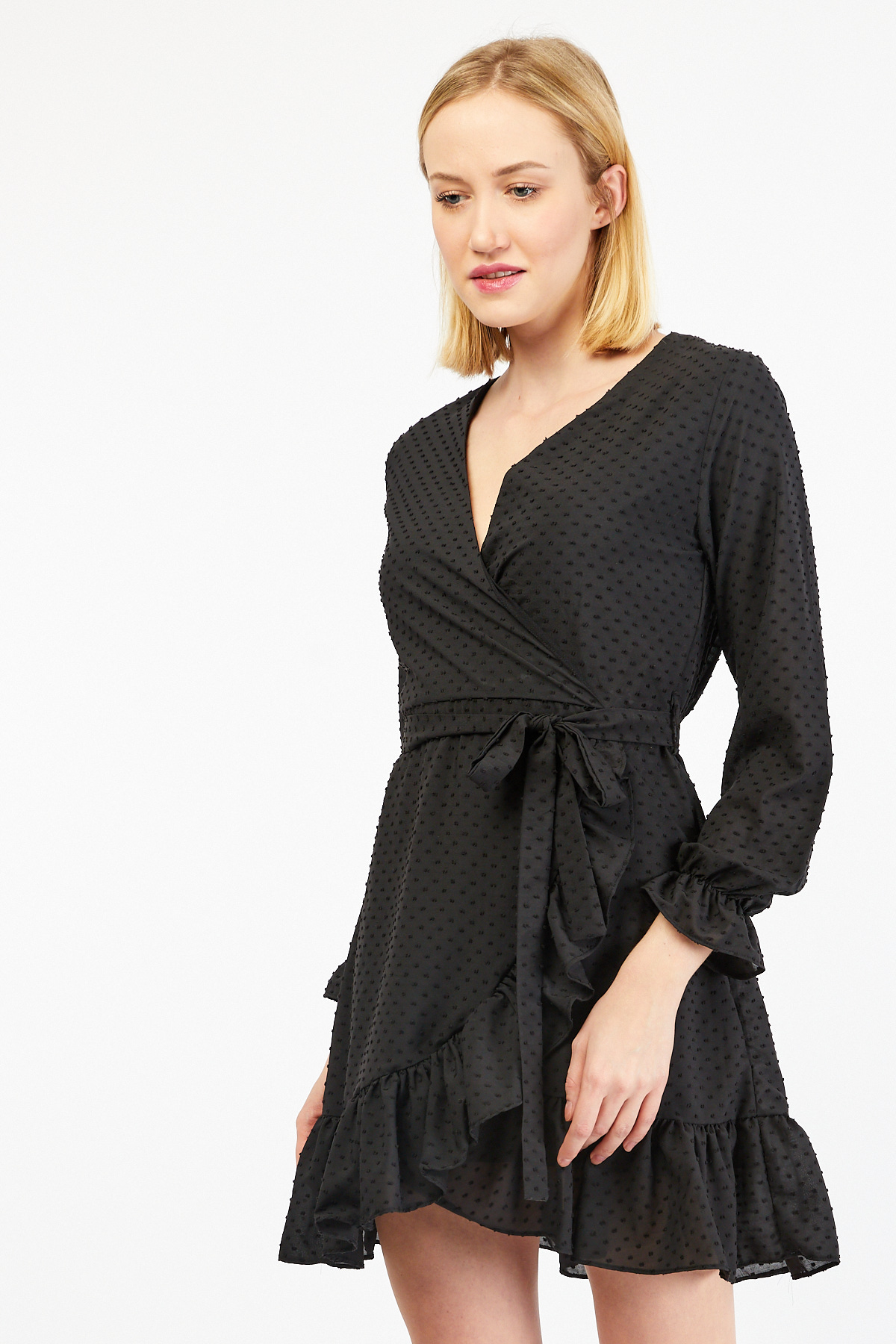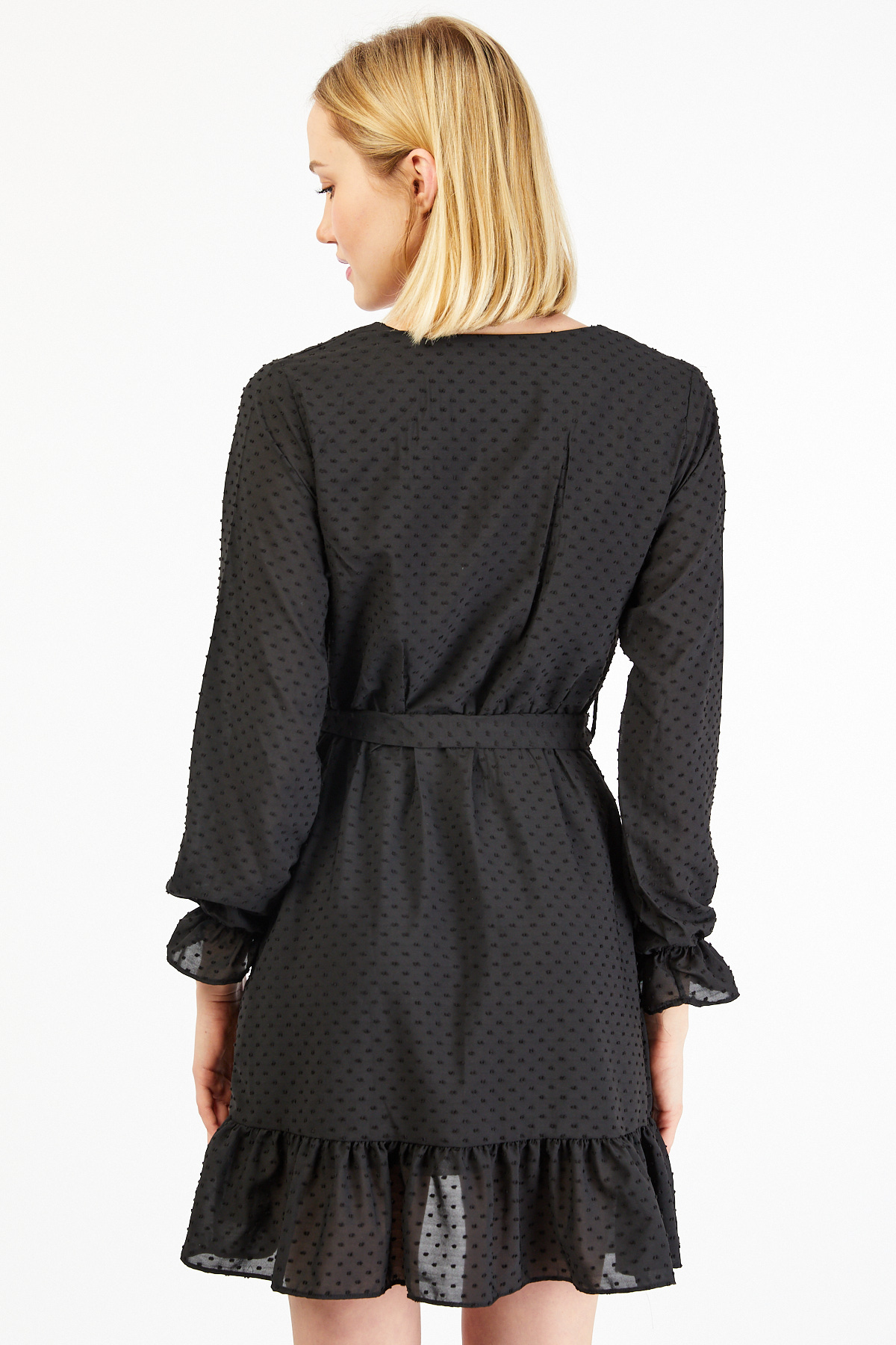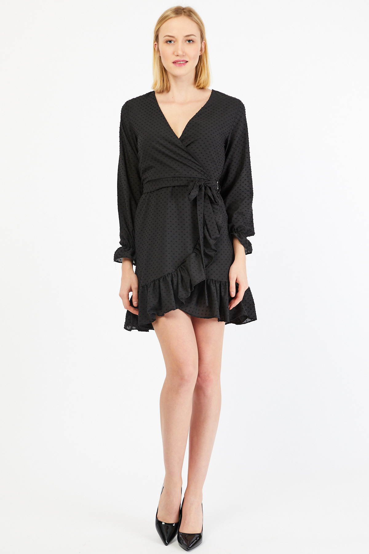 Ürün Özellikleri: Anvelop kesim, puantiye desenli, iç göstermeyen tül kumaş, mini siyah elbise.