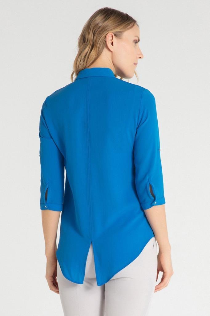 Ürün Özellikleri: Klasik yaka, arka etek kısmı yırtmaç detaylı, gizli düğme iliklemeli, bol kalıp, yarım kollu gömlek.