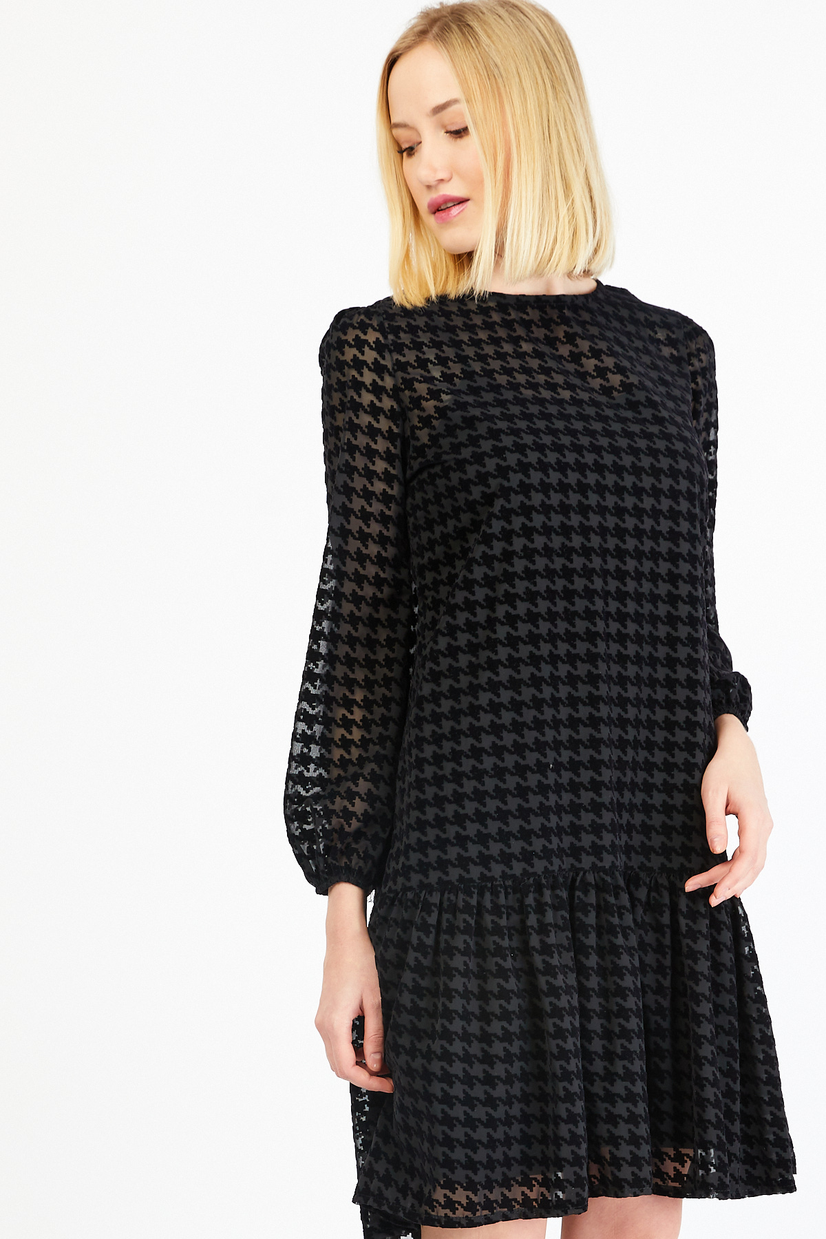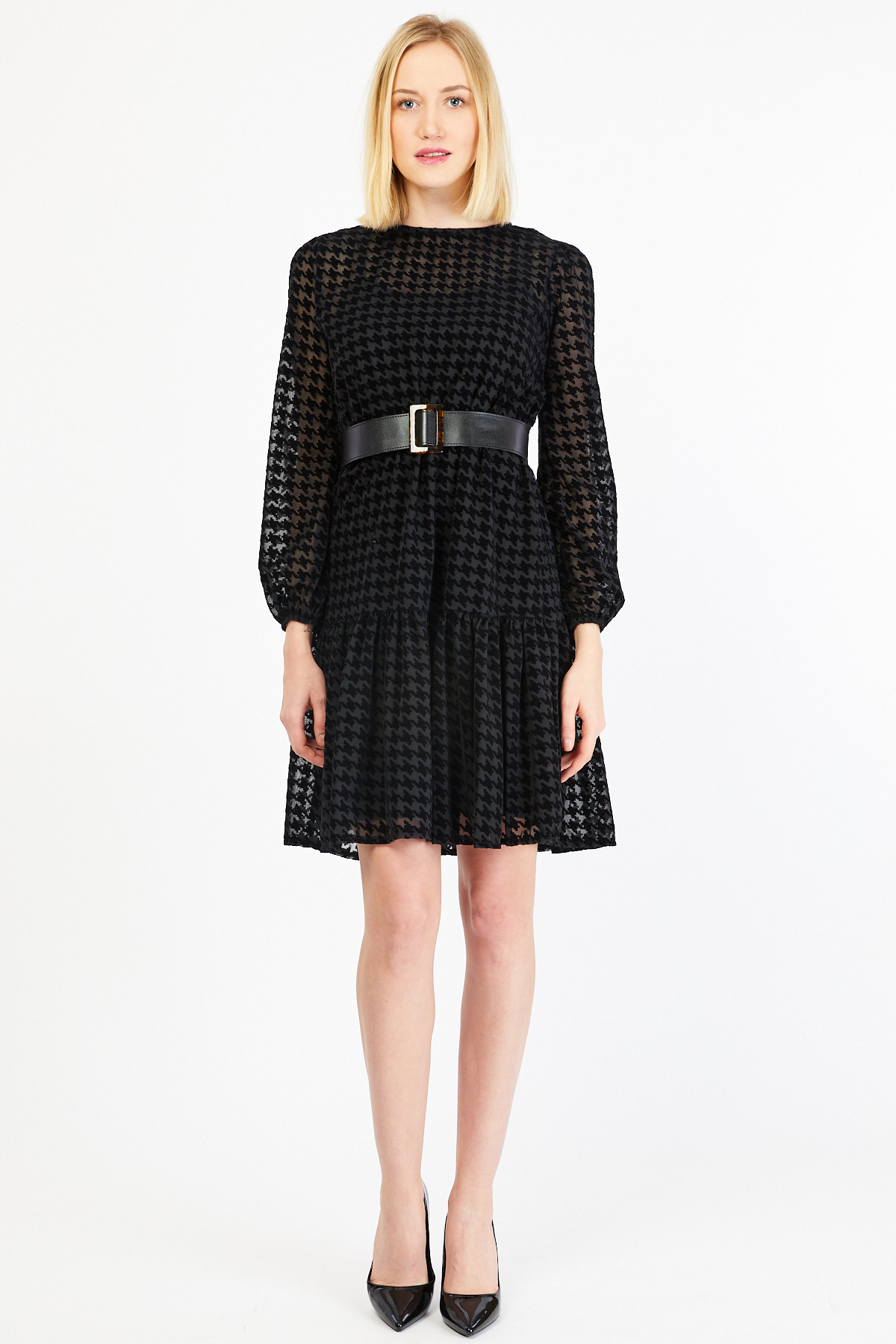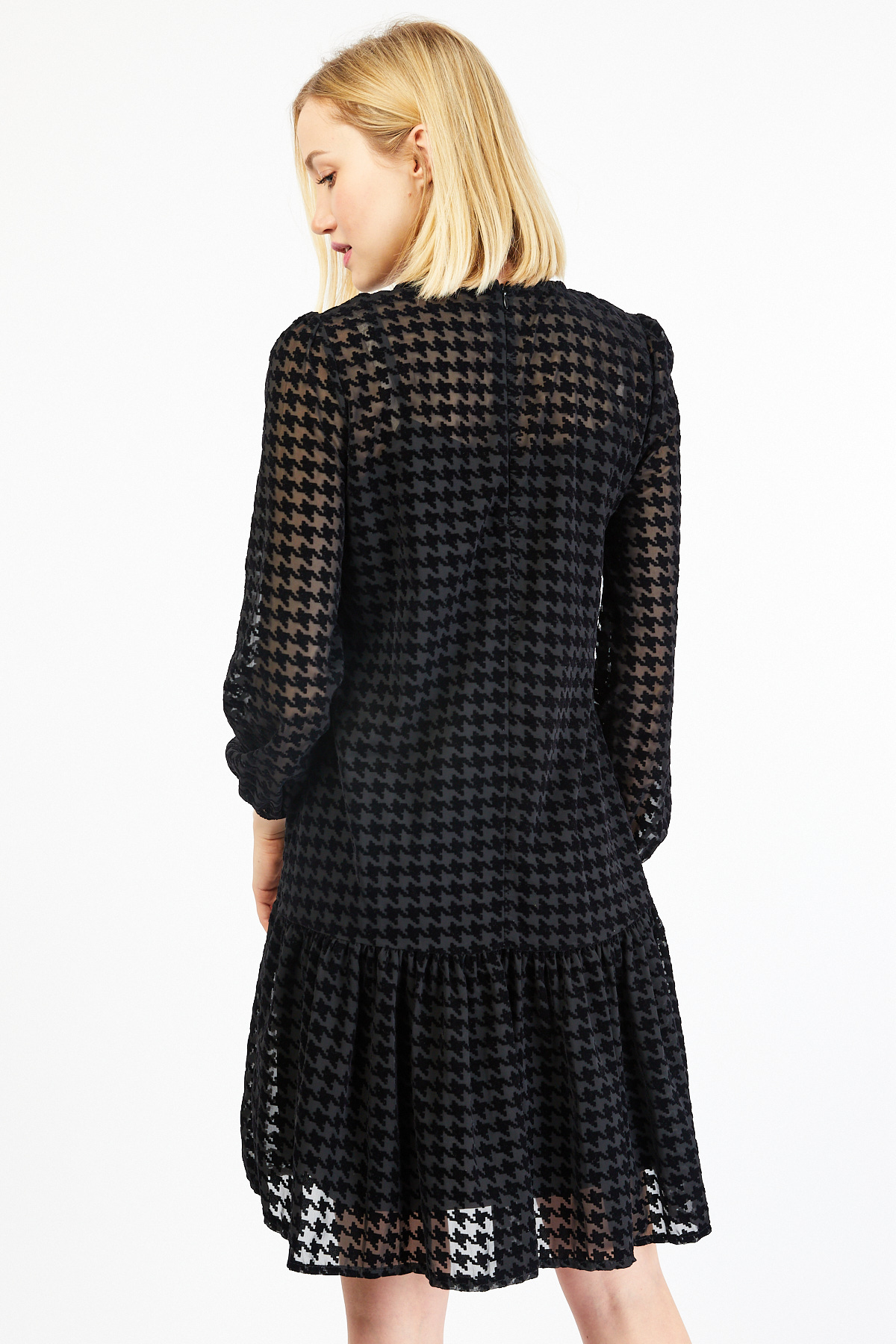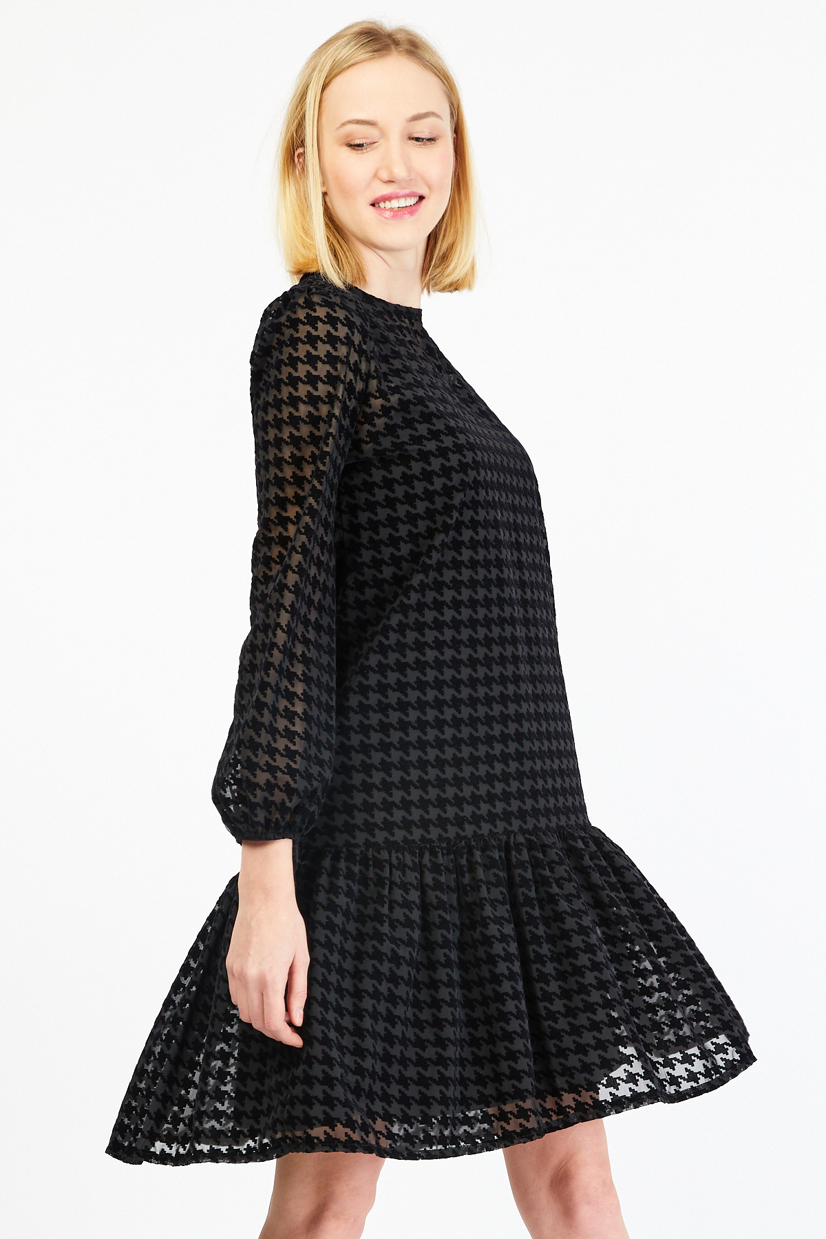 Ürün Özellikleri: Kaz ayağı desenli, astarlı, etekleri fırfırlı, uzun kollu elbise.