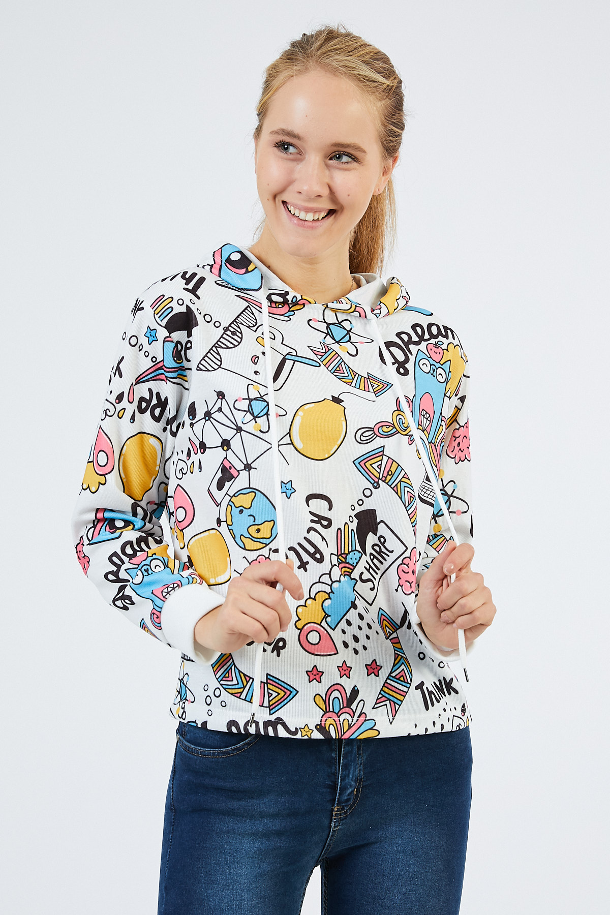 Ürün Özellikleri: Kapüşonlu, desenli, bol kalıp, düz uzun kollu sweatshirt.