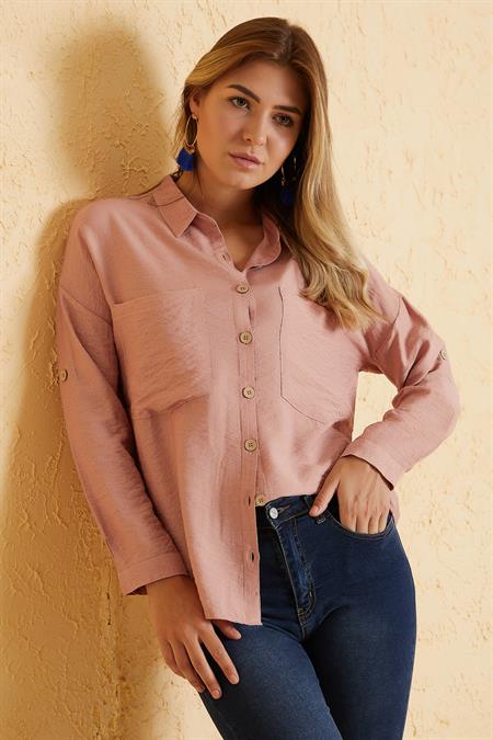 Tahta Düğmeli Cep Detaylı Pembe Gömlek