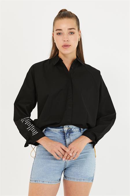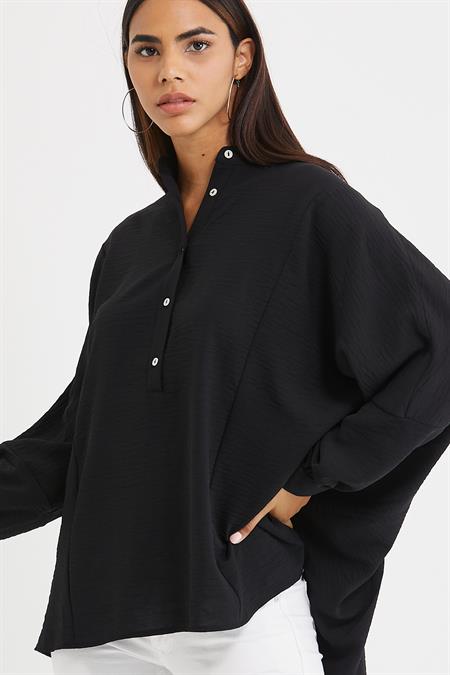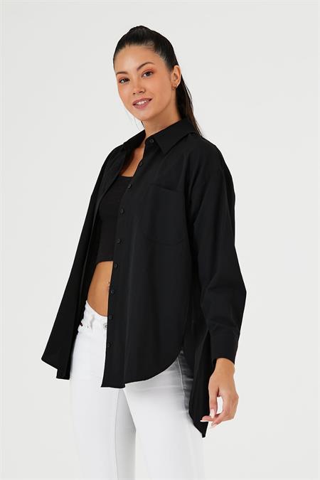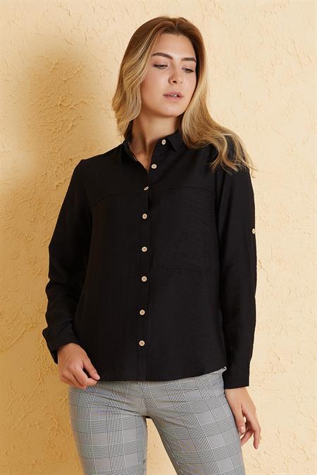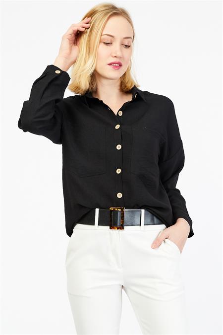 Tahta Düğmeli Çift Cep Detaylı Siyah Gömlek