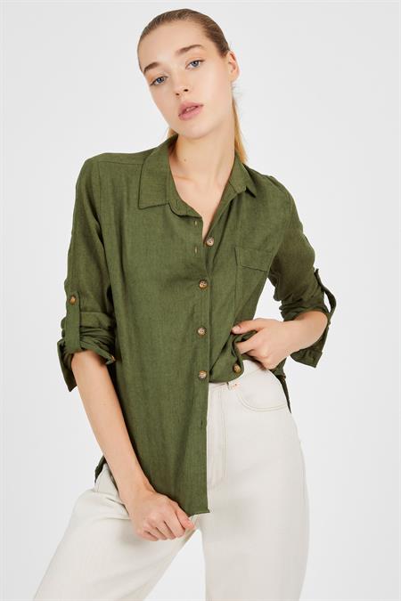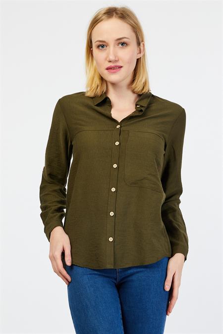 Tahta Düğmeli Cep Detaylı Haki Gömlek