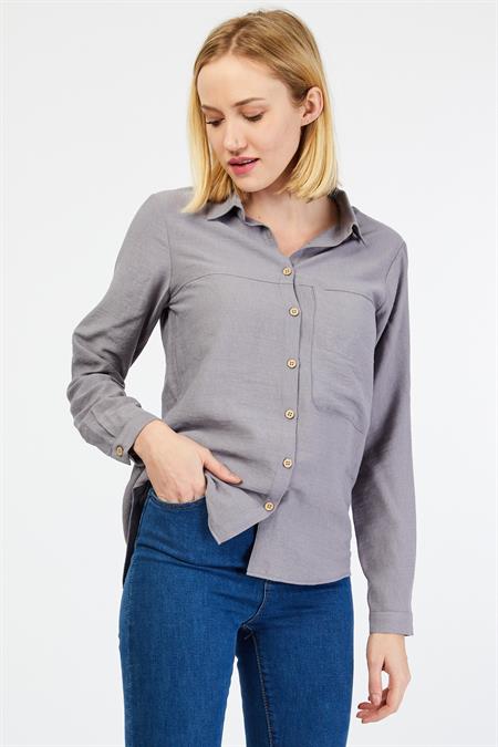 Tahta Düğmeli Çift Cep Detaylı Gri Gömlek