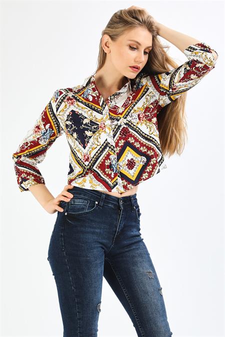 Uzun Kollu Çiçek Desenli Beyaz Crop Gömlek