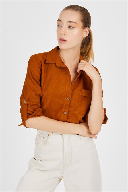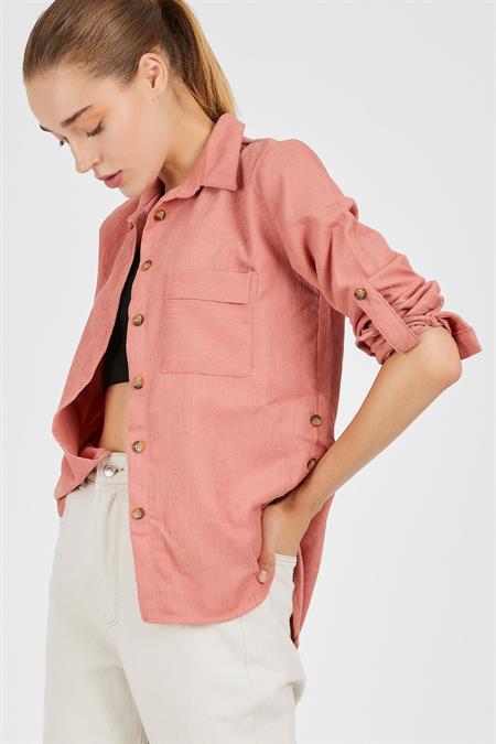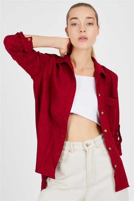Tahta Düğmeli Cep Detaylı Kırmızı Gömlek