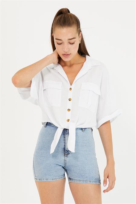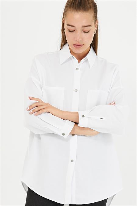 Tahta Düğmeli Çift Cep Detaylı Beyaz Gömlek