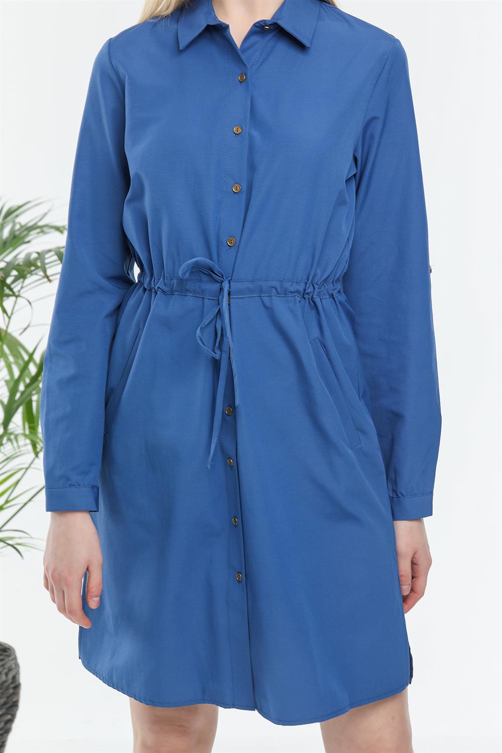 Belden Büzgülü Tahta Düğmeli Tunik Elbise