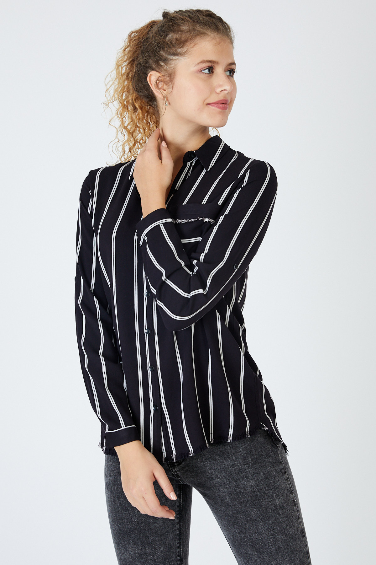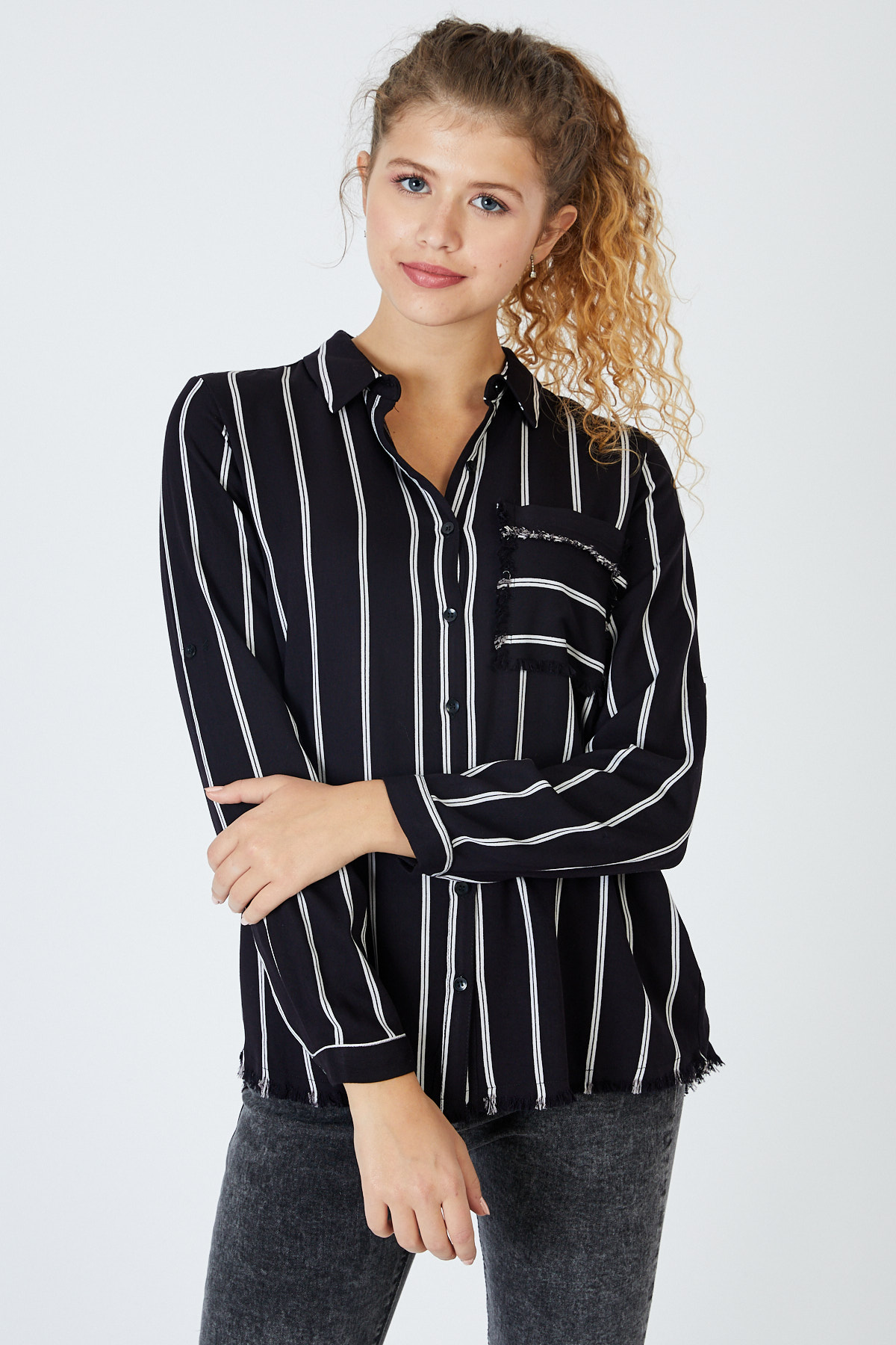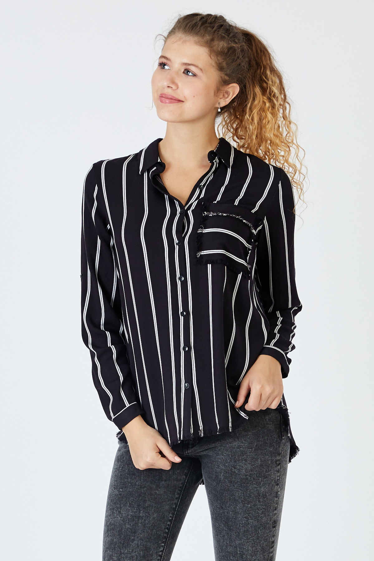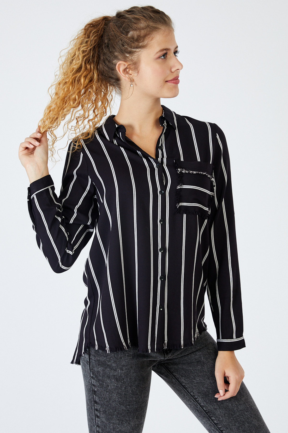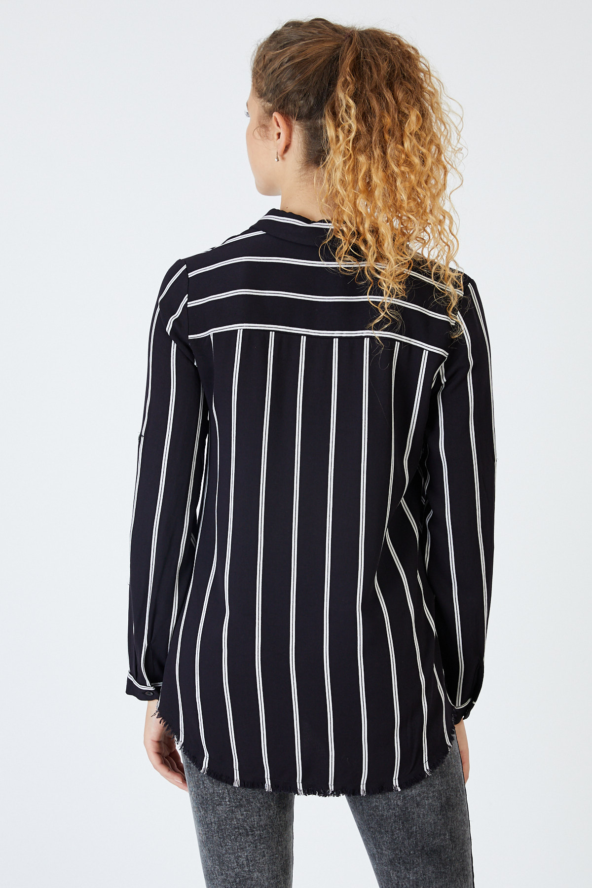 Ürün Özellikleri: Klasik yaka, çizgili, beyaz düğmeli, tam kalıp, cep ve etek kısımları püskül detaylı, uzun kollu gömlek.