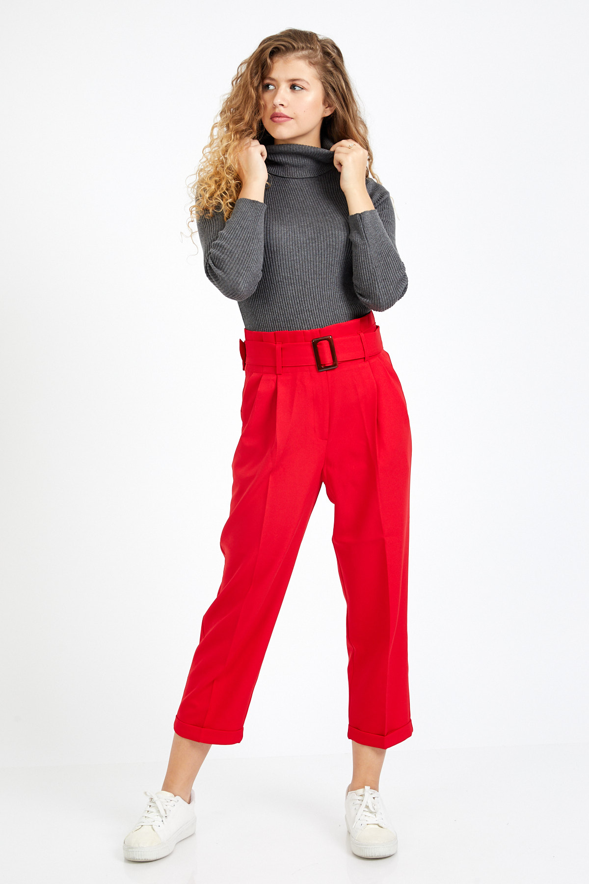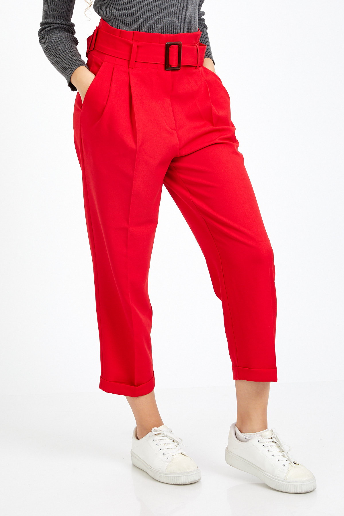 Ürün Özellikleri: Yüksek bel, kemer detaylı, ön cepli, düz paça, havuç kesim, düğme-fermuarlı kapama pantolon.