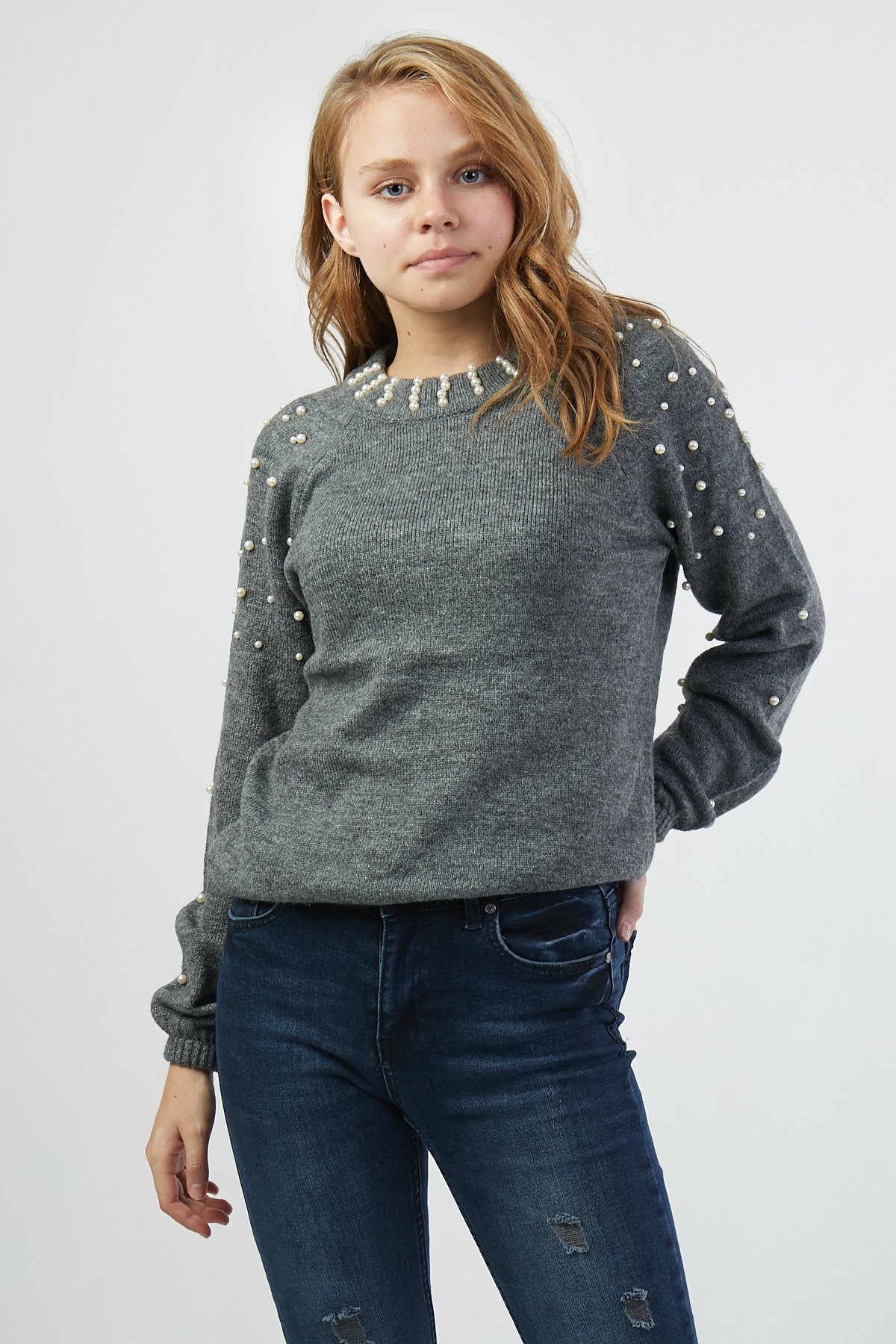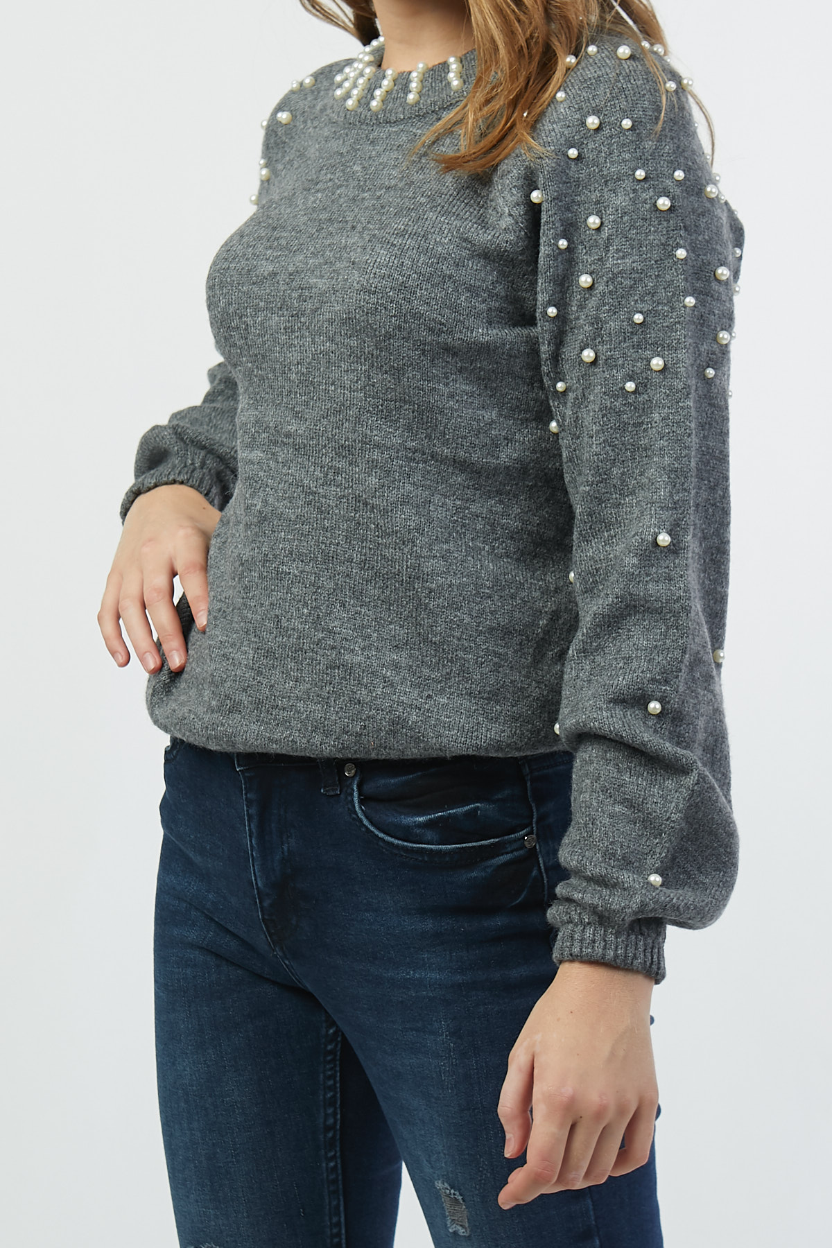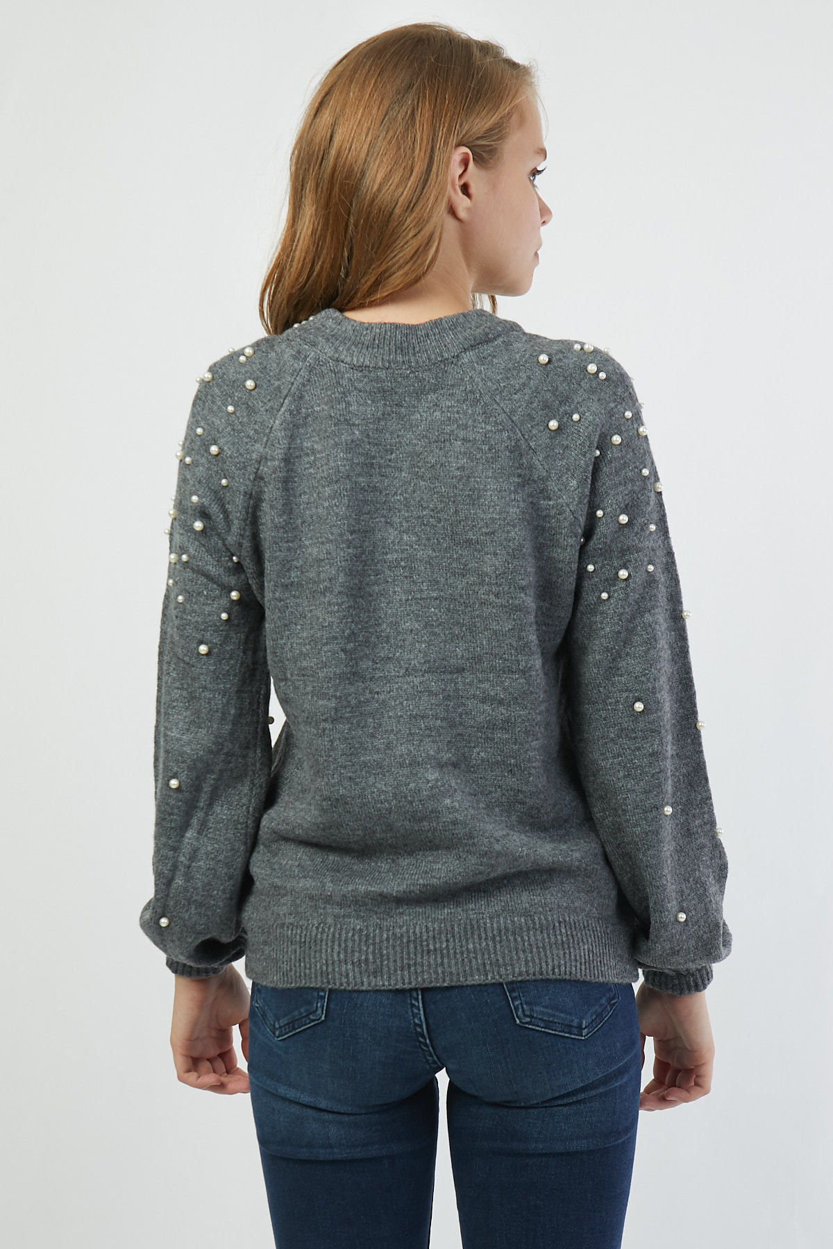 Boncuk Detaylı Gri Kazak