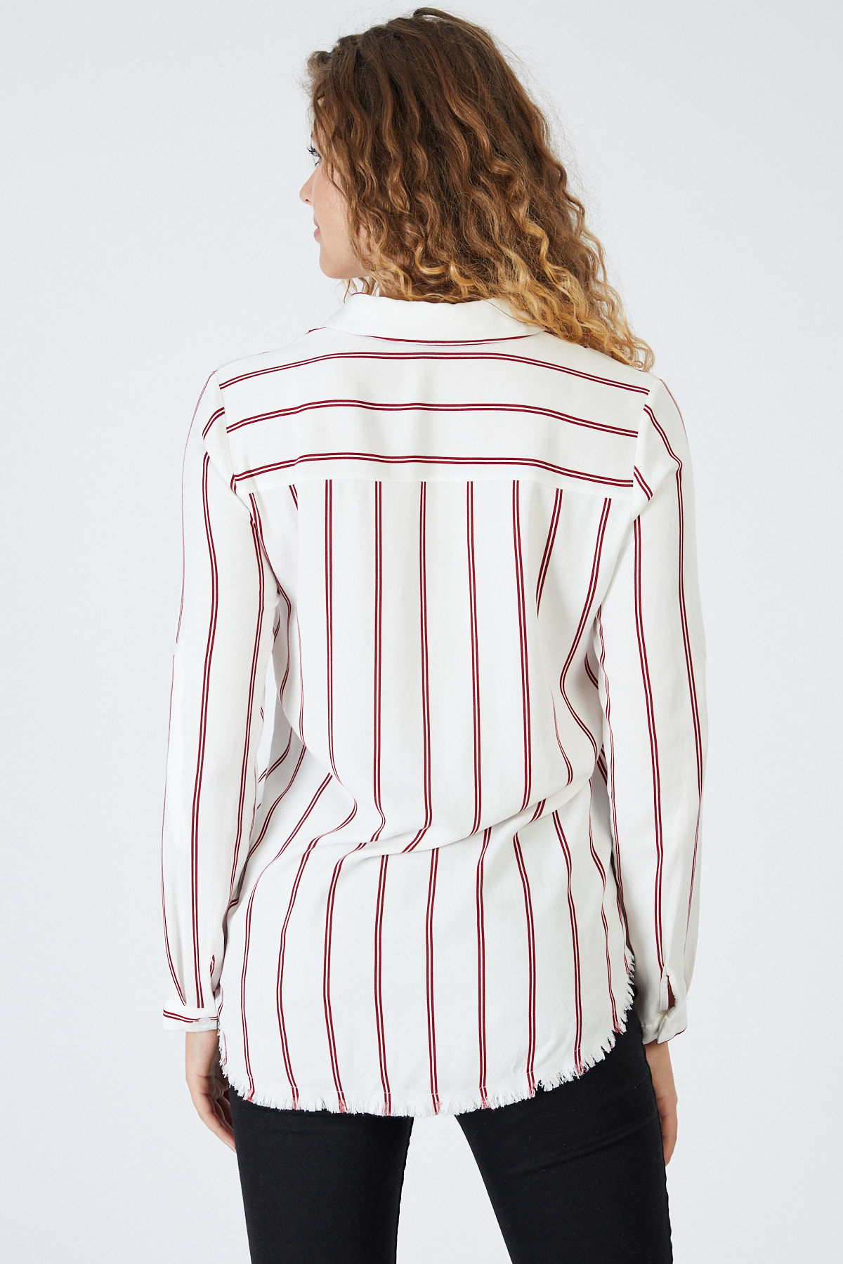 Ürün Özellikleri: Klasik yaka, çizgili, beyaz düğmeli, tam kalıp, cep ve etek kısımları püskül detaylı, uzun kollu gömlek.