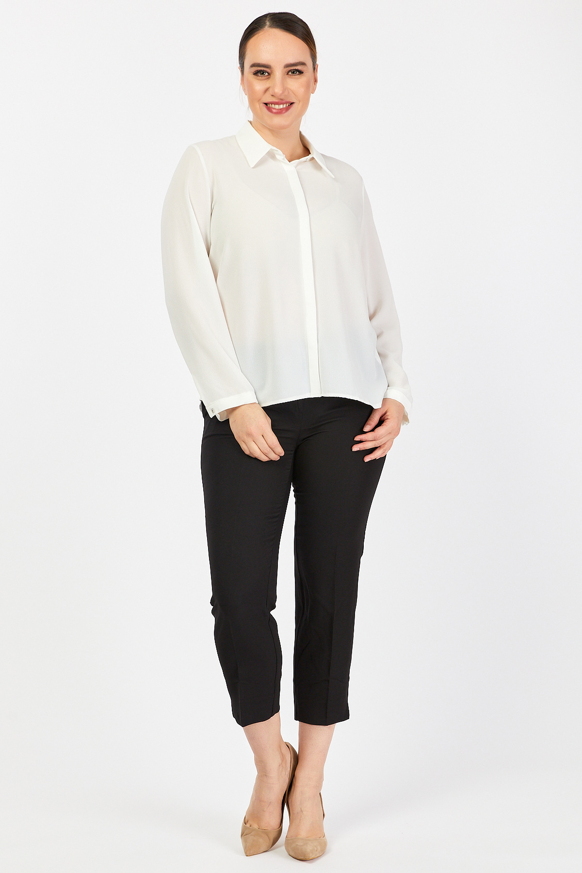 Ürün Özellikleri: Klasik yaka özellikli, gizli düğme iliklemeli, tam kalıp, uzun kollu büyük beden gömlek.