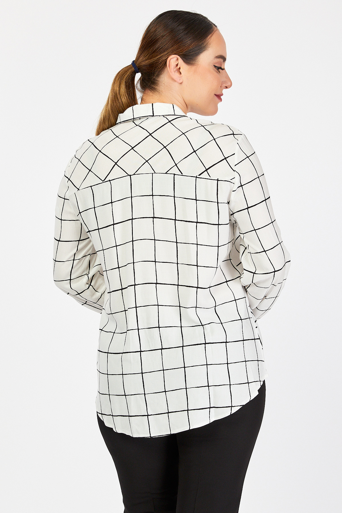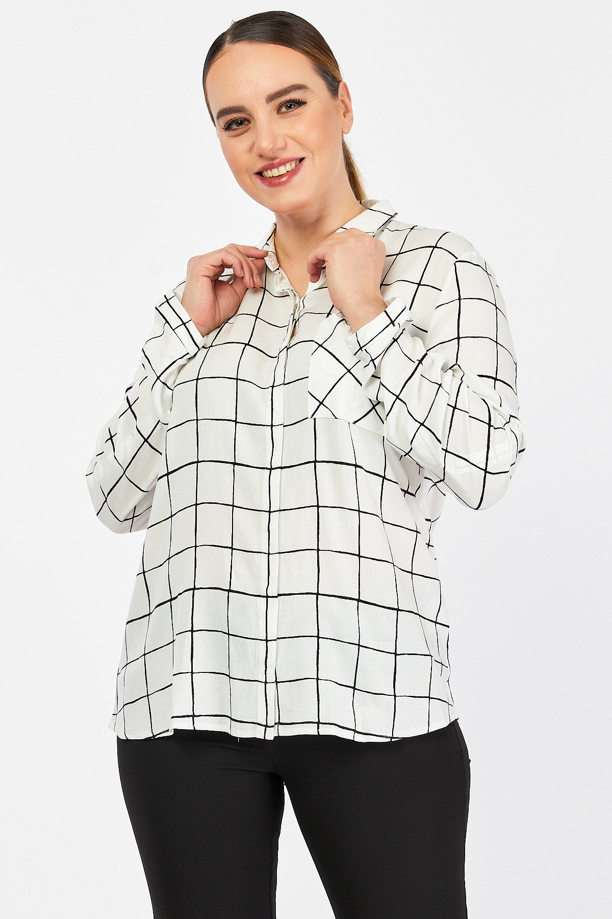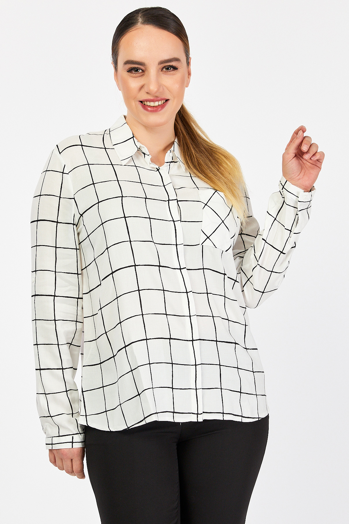 Büyük Beden Cep Detaylı Kareli Beyaz Gömlek