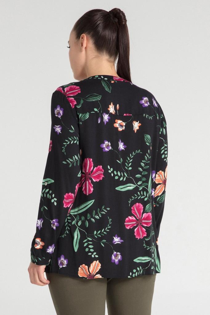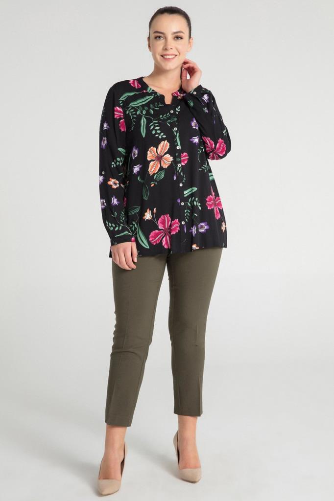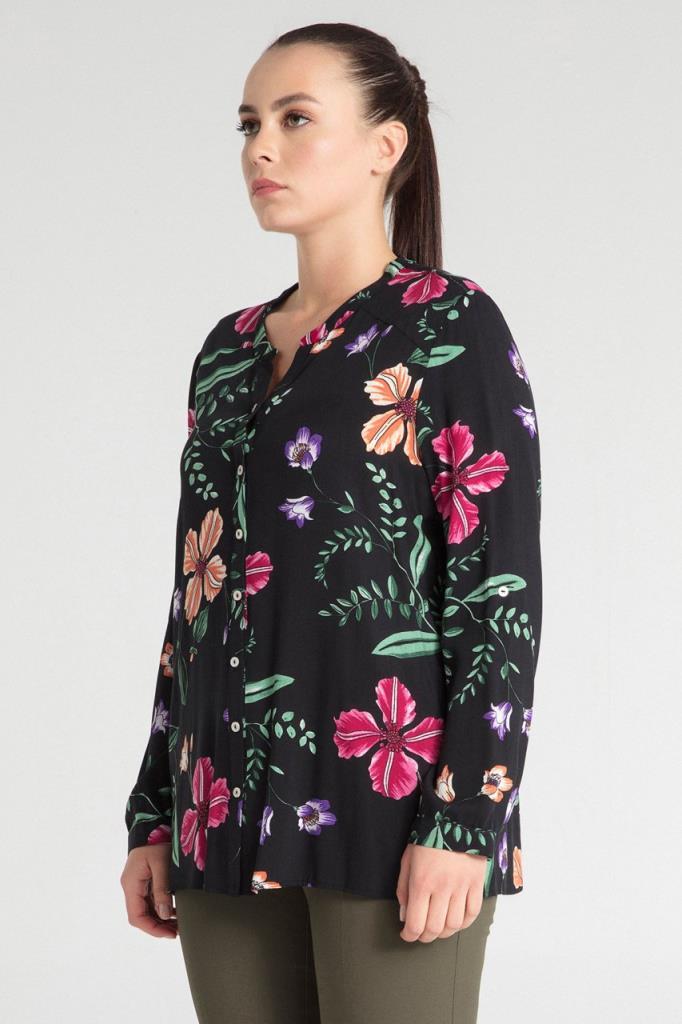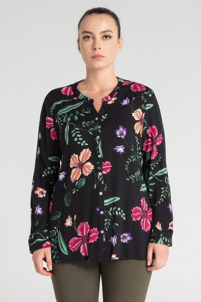 Büyük Beden Çiçek Baskılı Siyah Gömlek