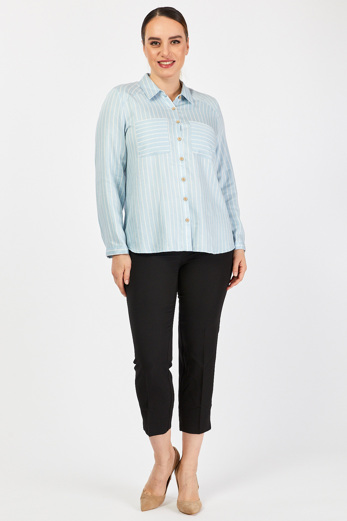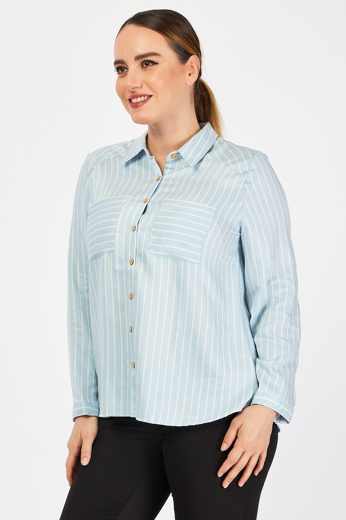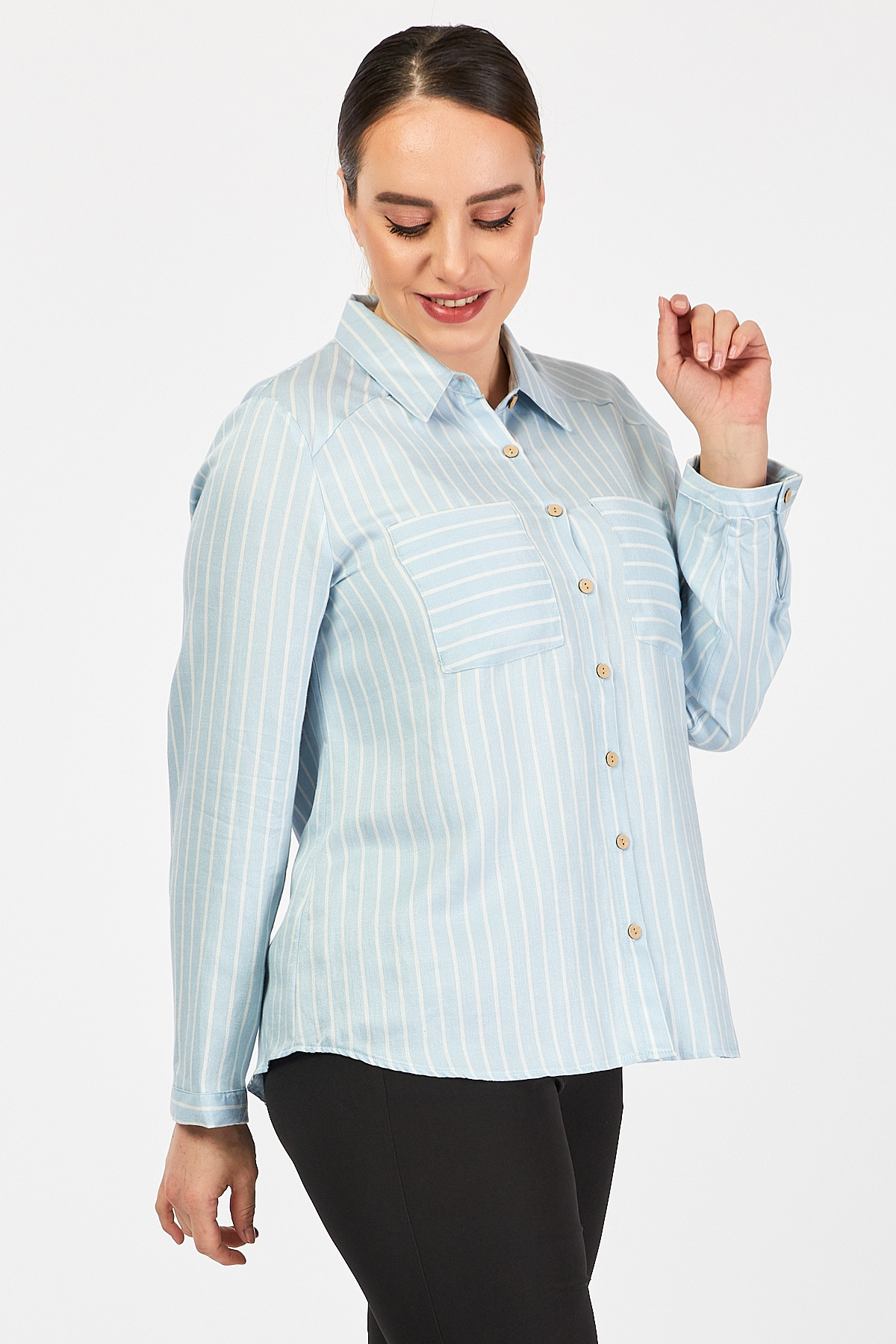 Ürün Özellikleri: Klasik yaka özellikli, tahta düğmeli, cep detaylı, tam kalıp, uzun kollu büyük beden gömlek.