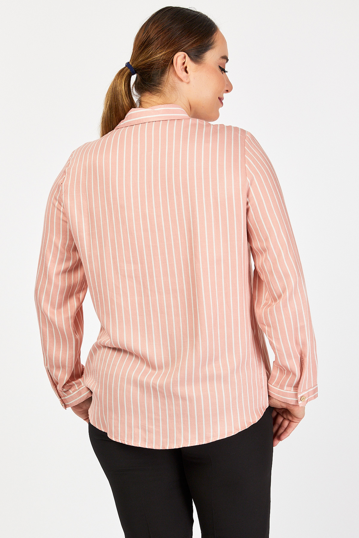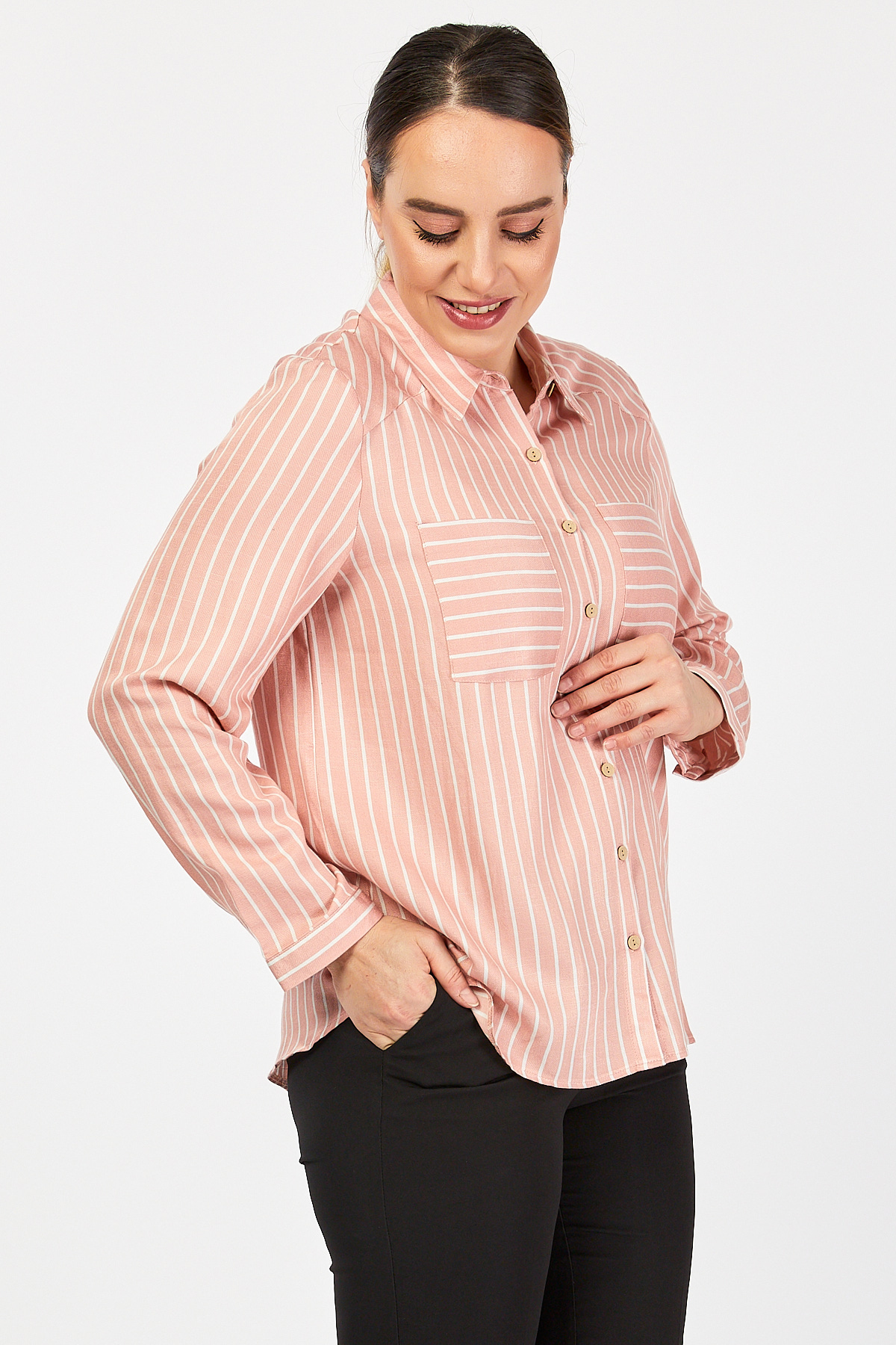 Ürün Özellikleri: Klasik yaka özellikli, tahta düğmeli, cep detaylı, tam kalıp, uzun kollu büyük beden gömlek.
