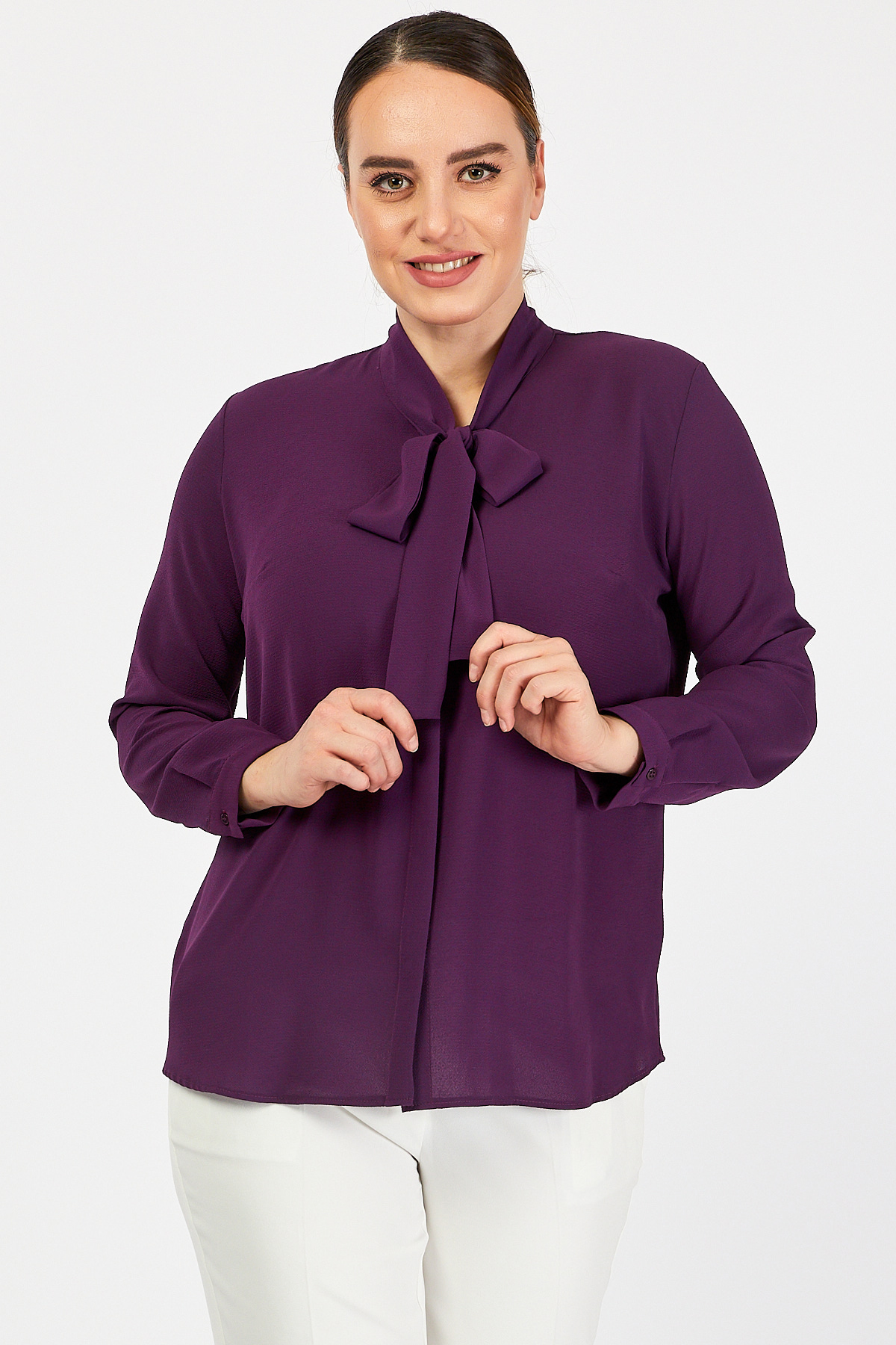 Ürün Özellikleri: Yakası fular detaylı, gizli düğme iliklemeli, tam kalıp, uzun kollu büyük beden gömlek.