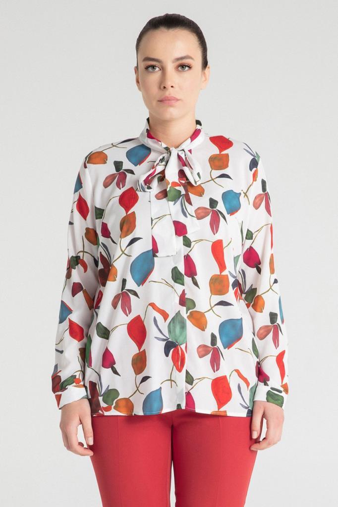 Ürün Özellikleri: Yakası fular detaylı, gizli düğme iliklemeli, tam kalıp, uzun kollu büyük beden gömlek.