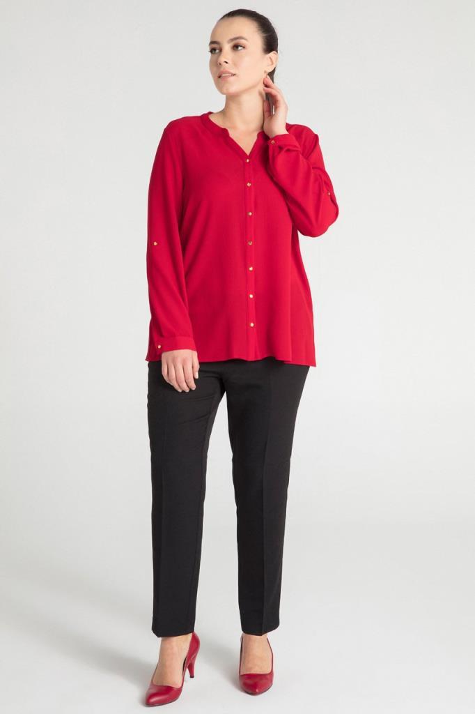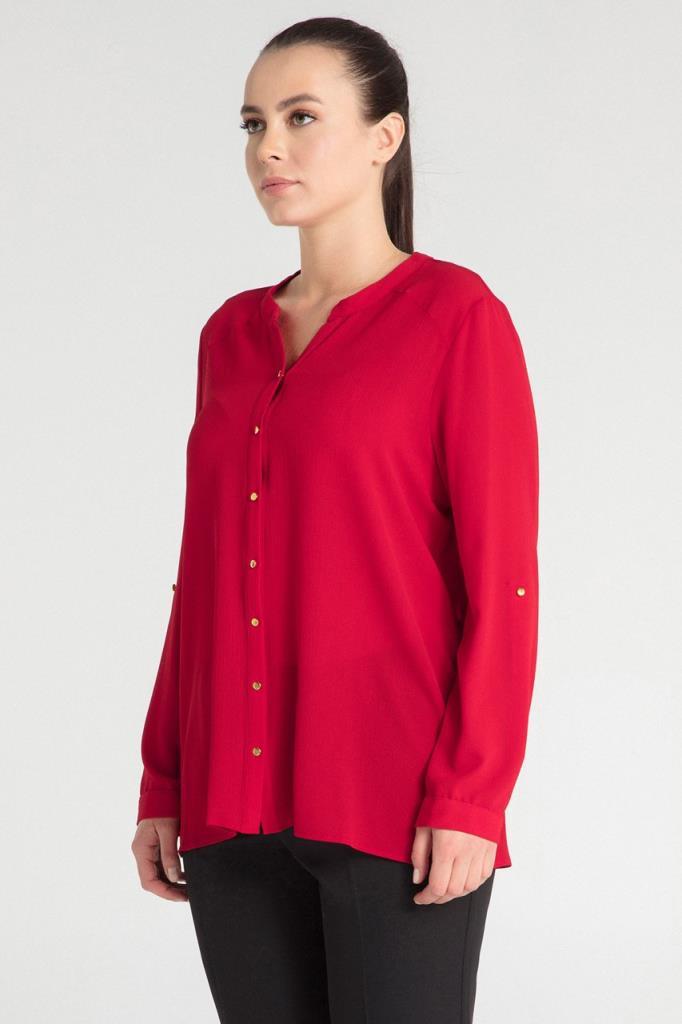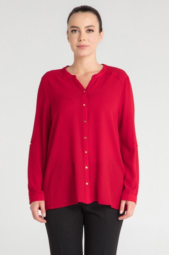 Ürün Özellikleri: Hakim yaka özellikli, altın rengi düğme detaylı, bol kalıp, uzun kollu büyük beden gömlek.