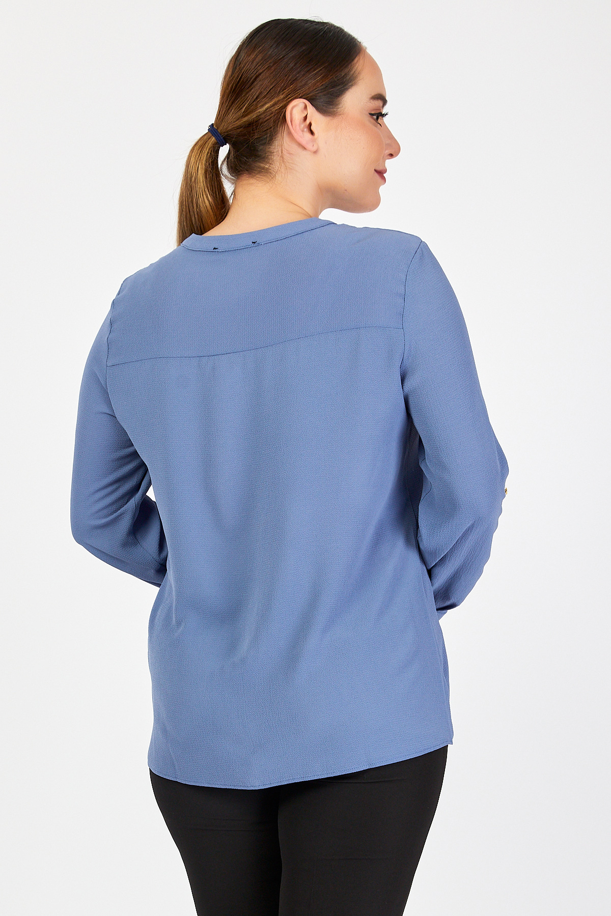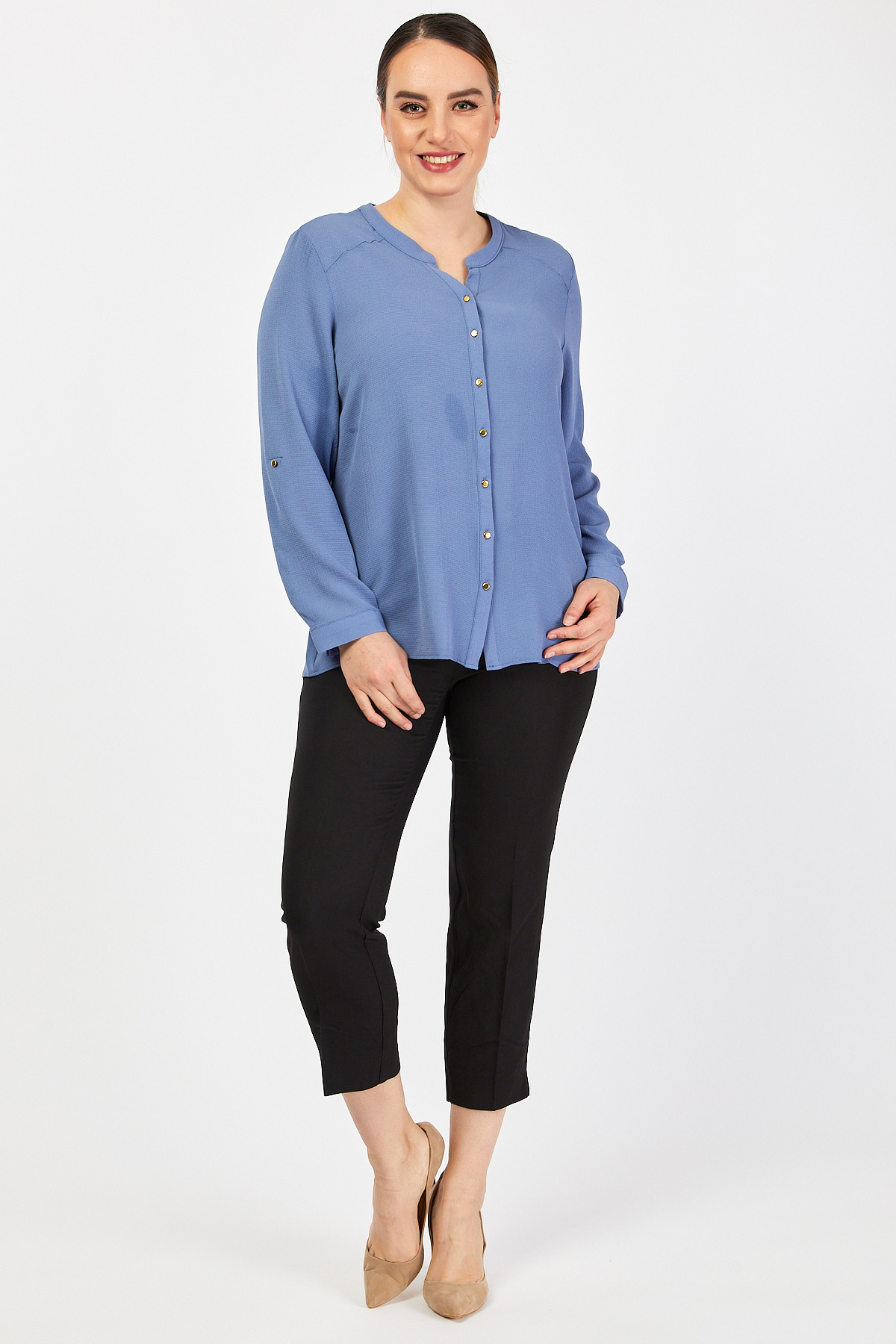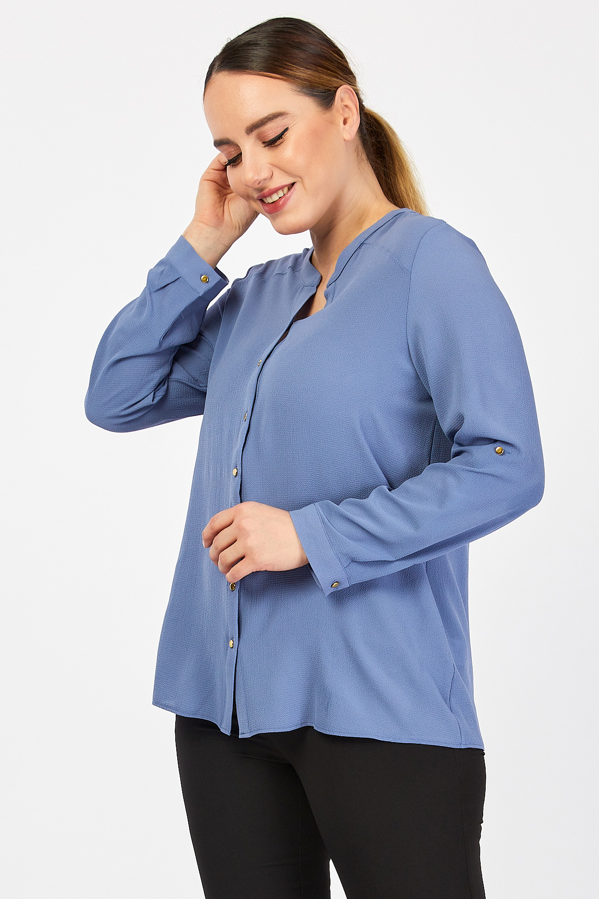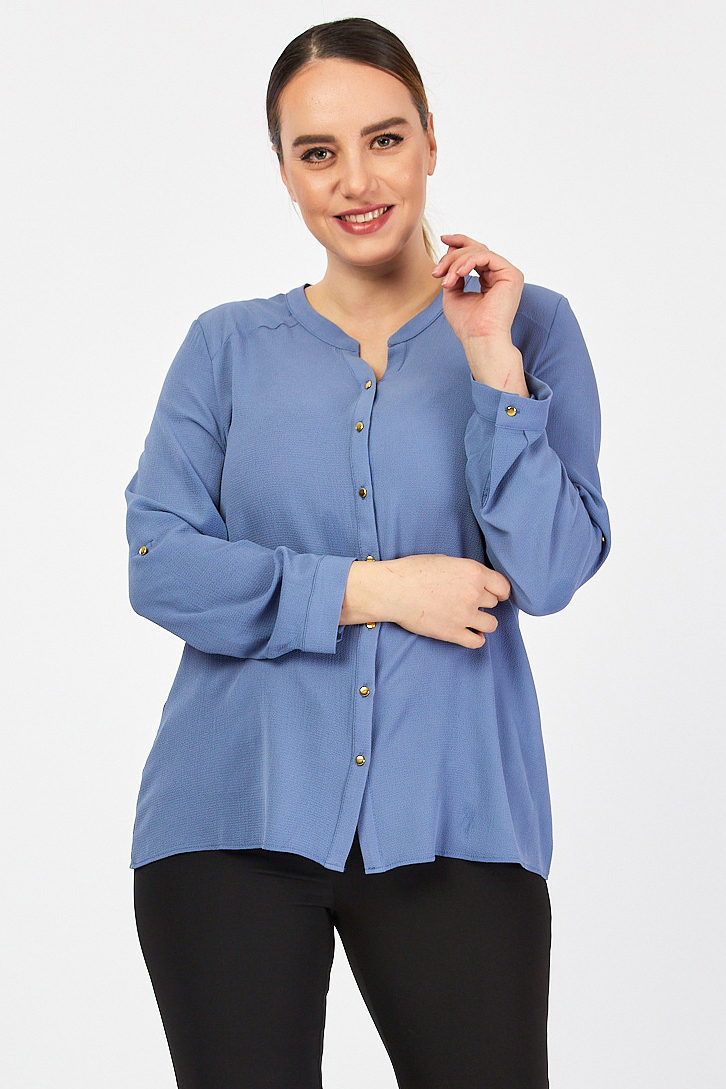 Ürün Özellikleri: Hakim yaka özellikli, altın rengi düğme detaylı, bol kalıp, uzun kollu büyük beden gömlek.