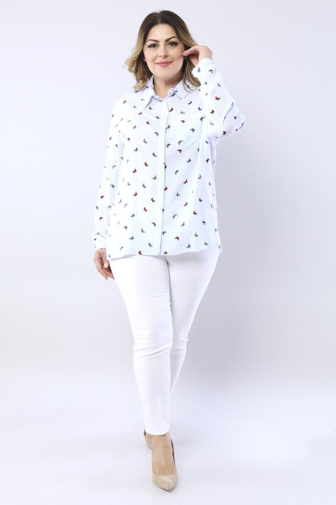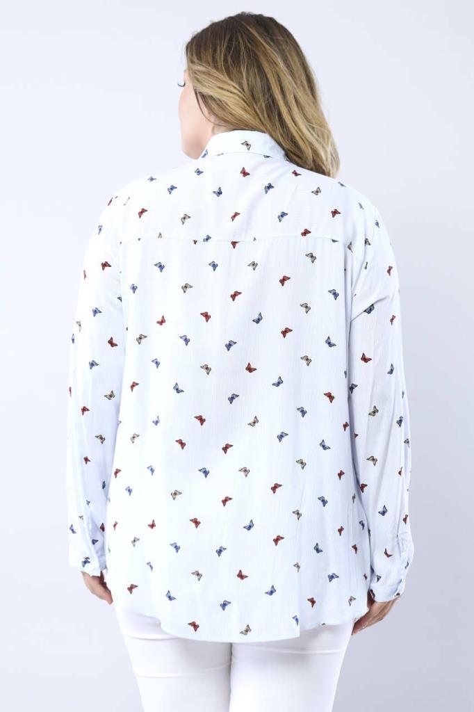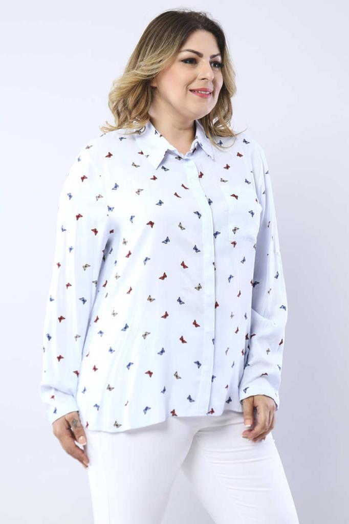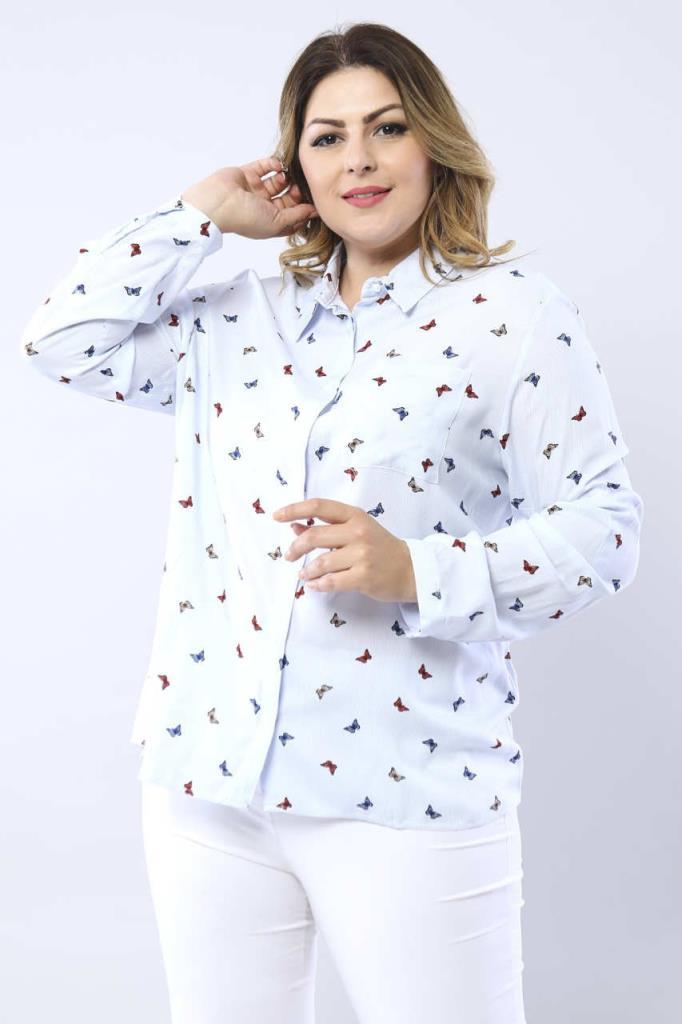 Büyük Beden Mavi Kelebek Desenli Gömlek