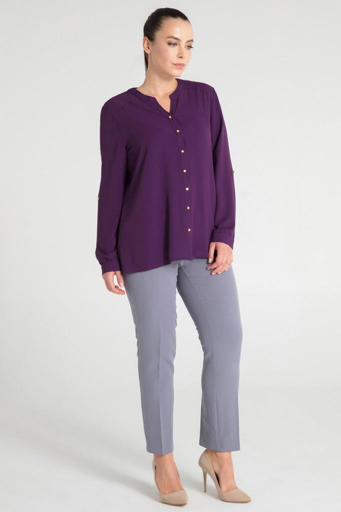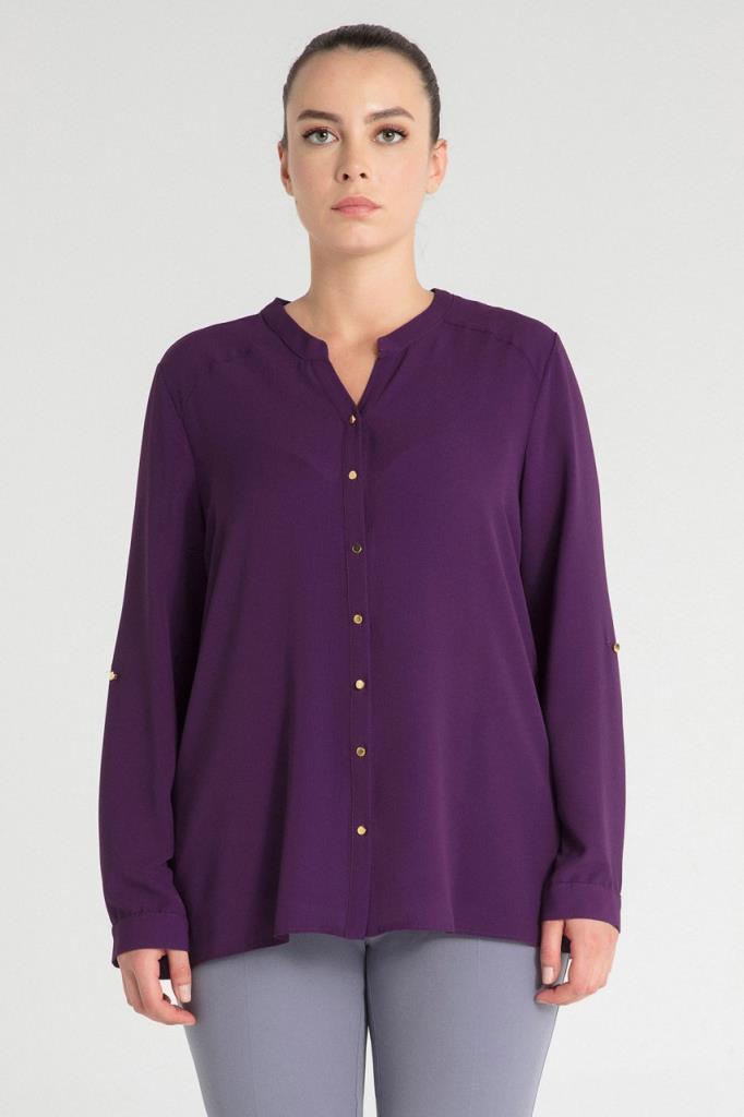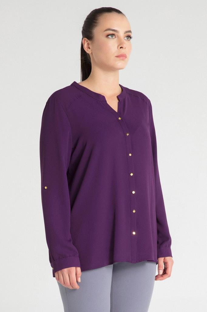 Ürün Özellikleri: Hakim yaka özellikli, altın rengi düğme detaylı, bol kalıp, uzun kollu büyük beden gömlek.