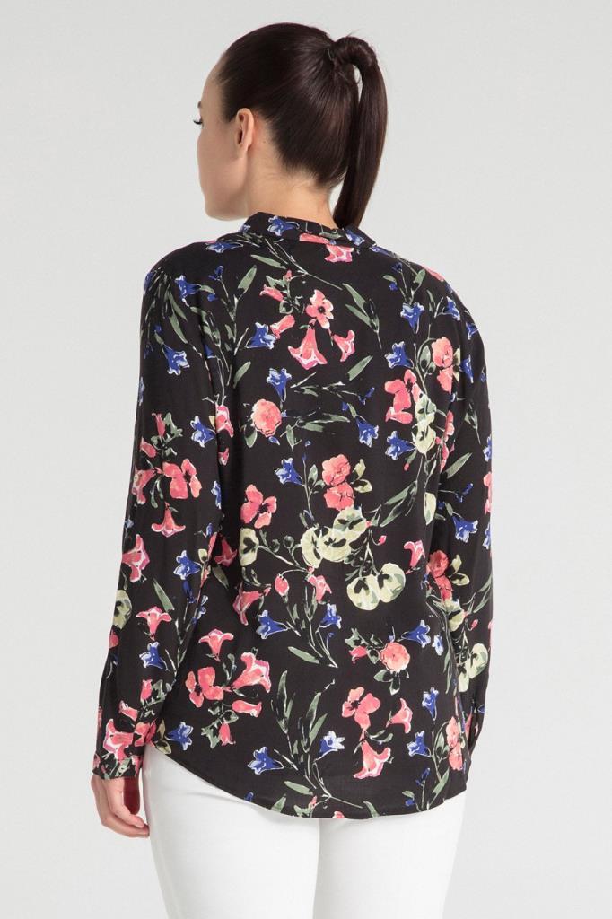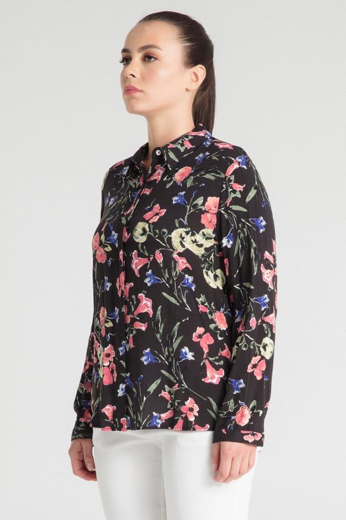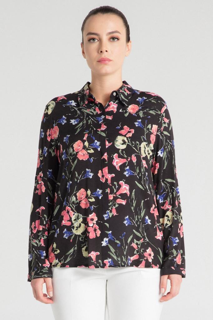 Büyük Beden Pembe Çiçek Baskılı Siyah Gömlek