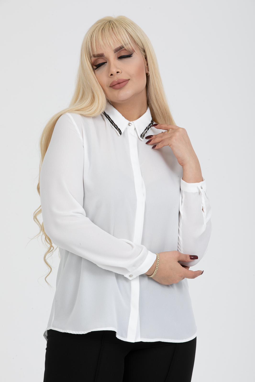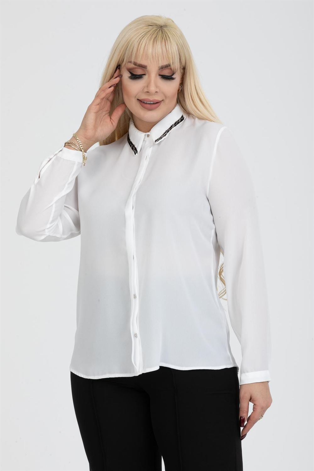 Büyük Beden Yaka Boncuklu Gömlek