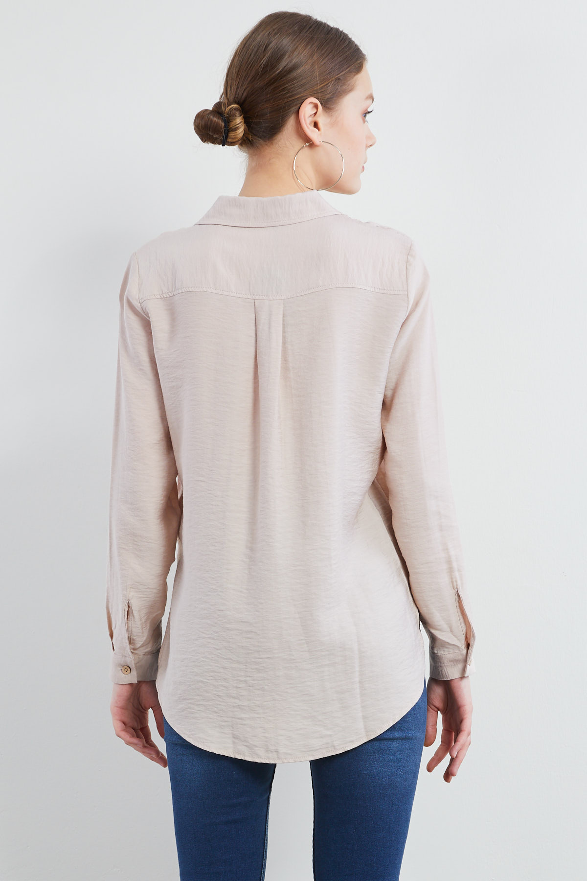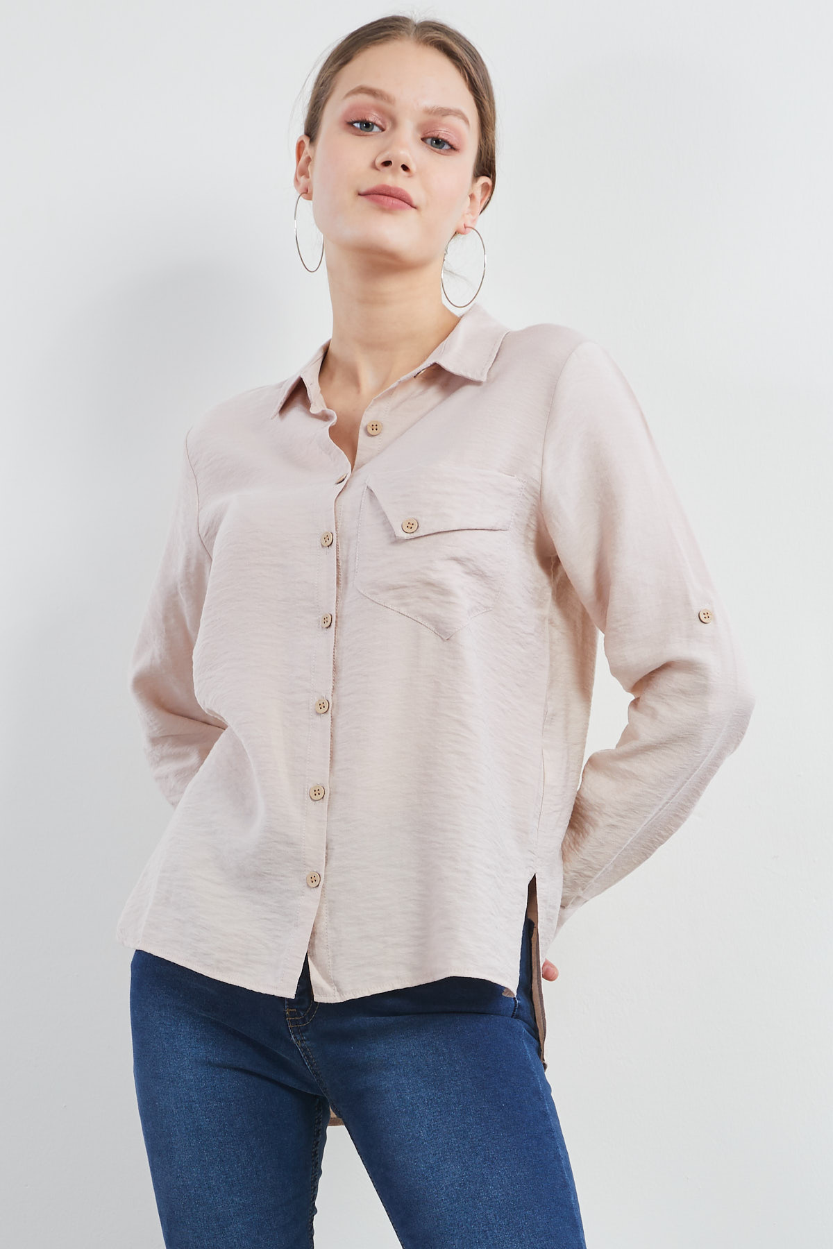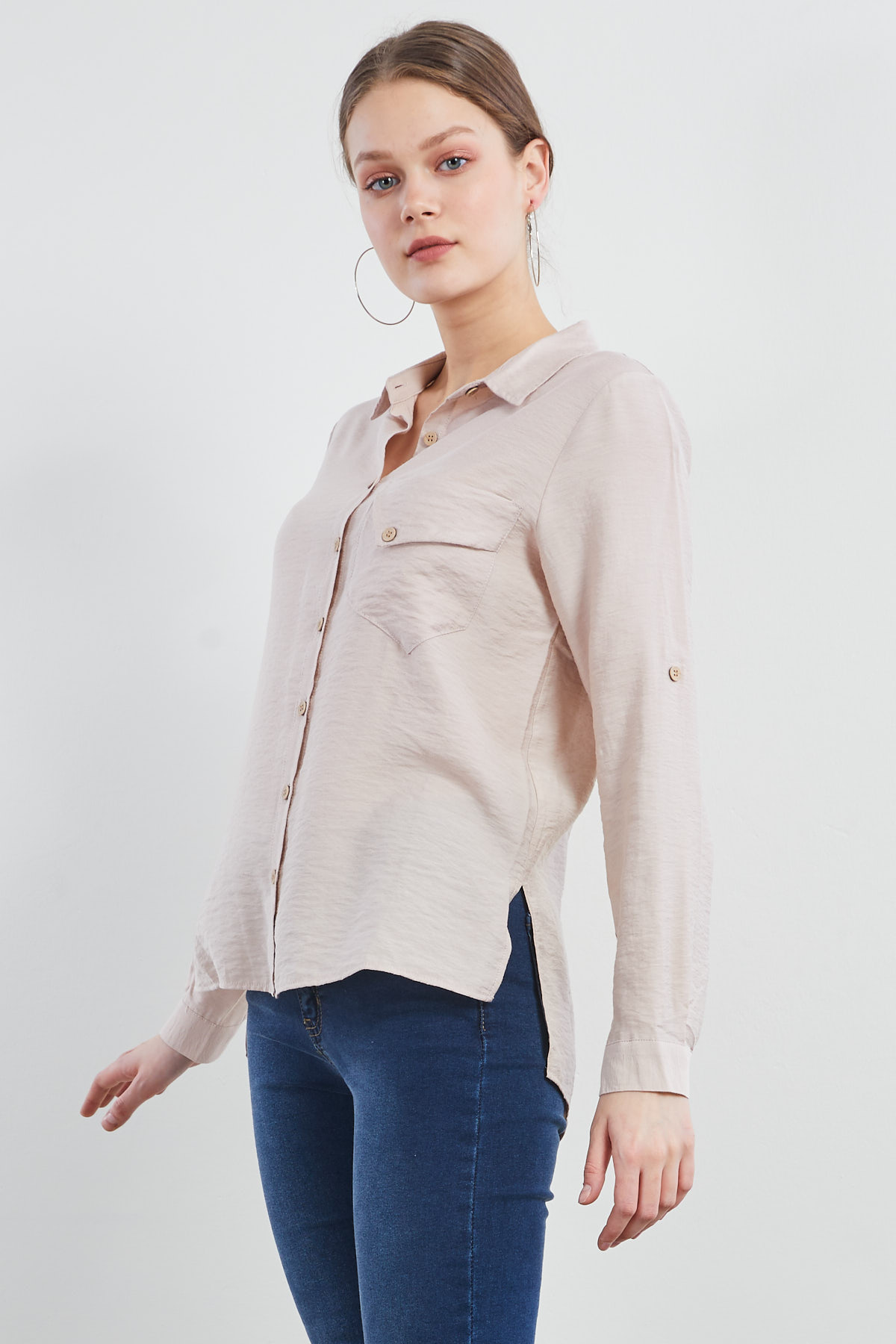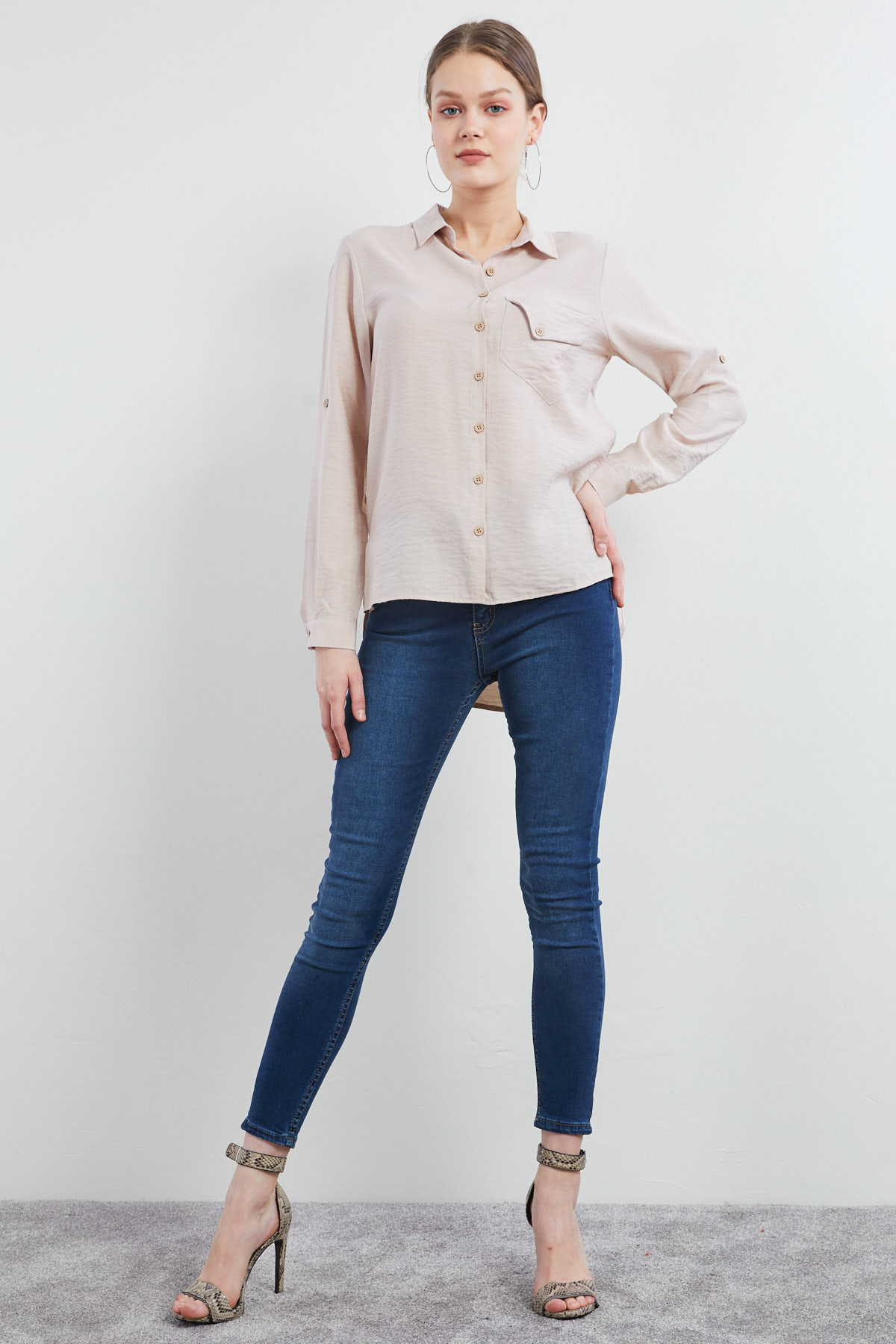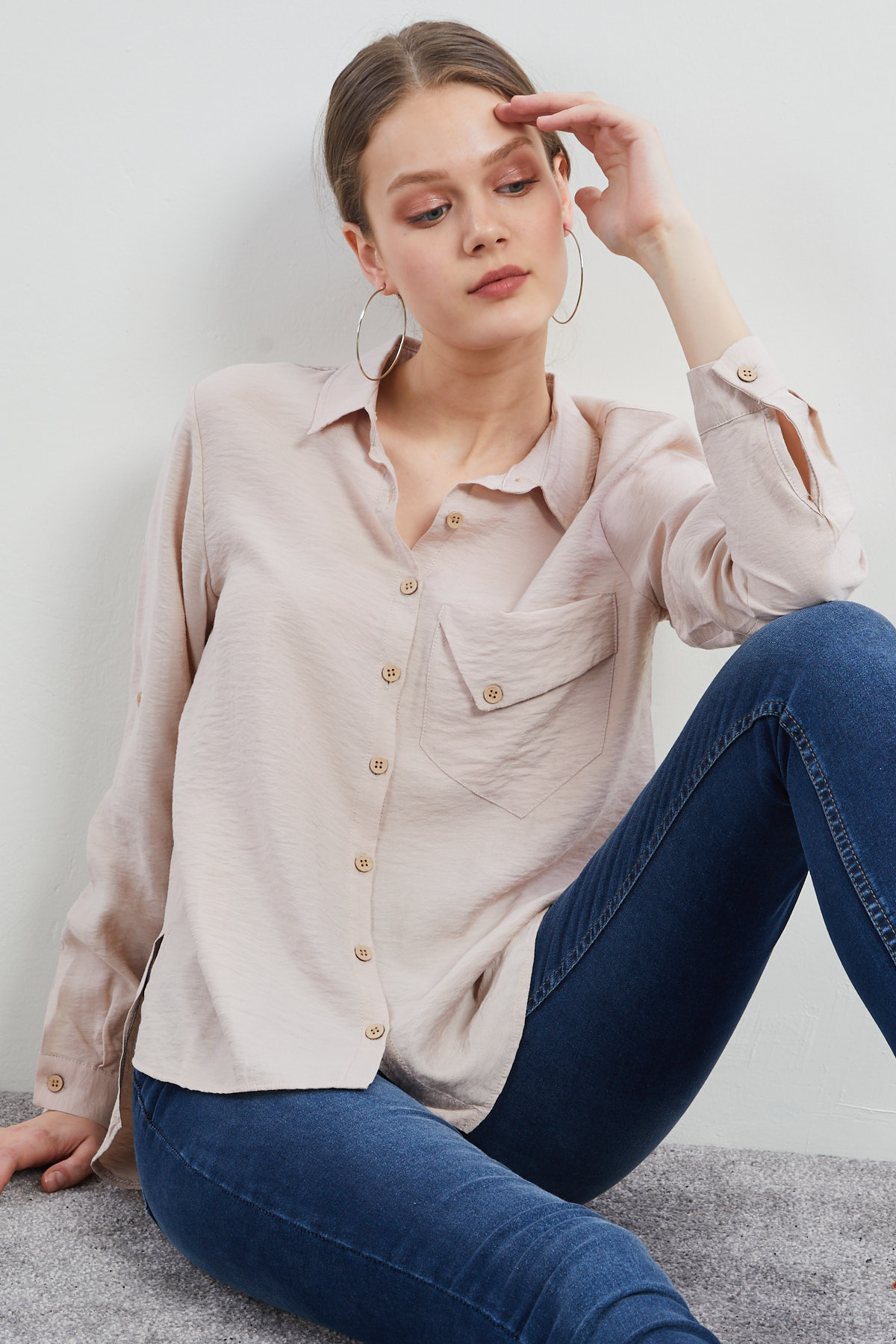 Ürün Özellikleri: Klasik yaka, tahta düğmeli, cep detaylı, tam kalıp, uzun kollu gömlek.