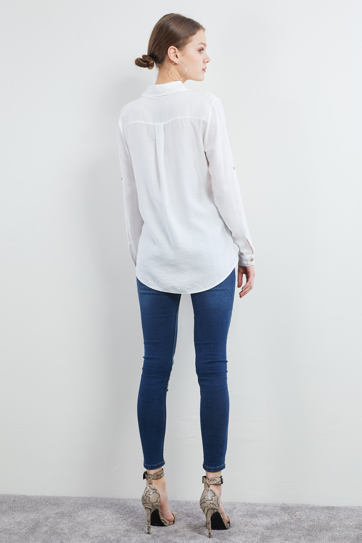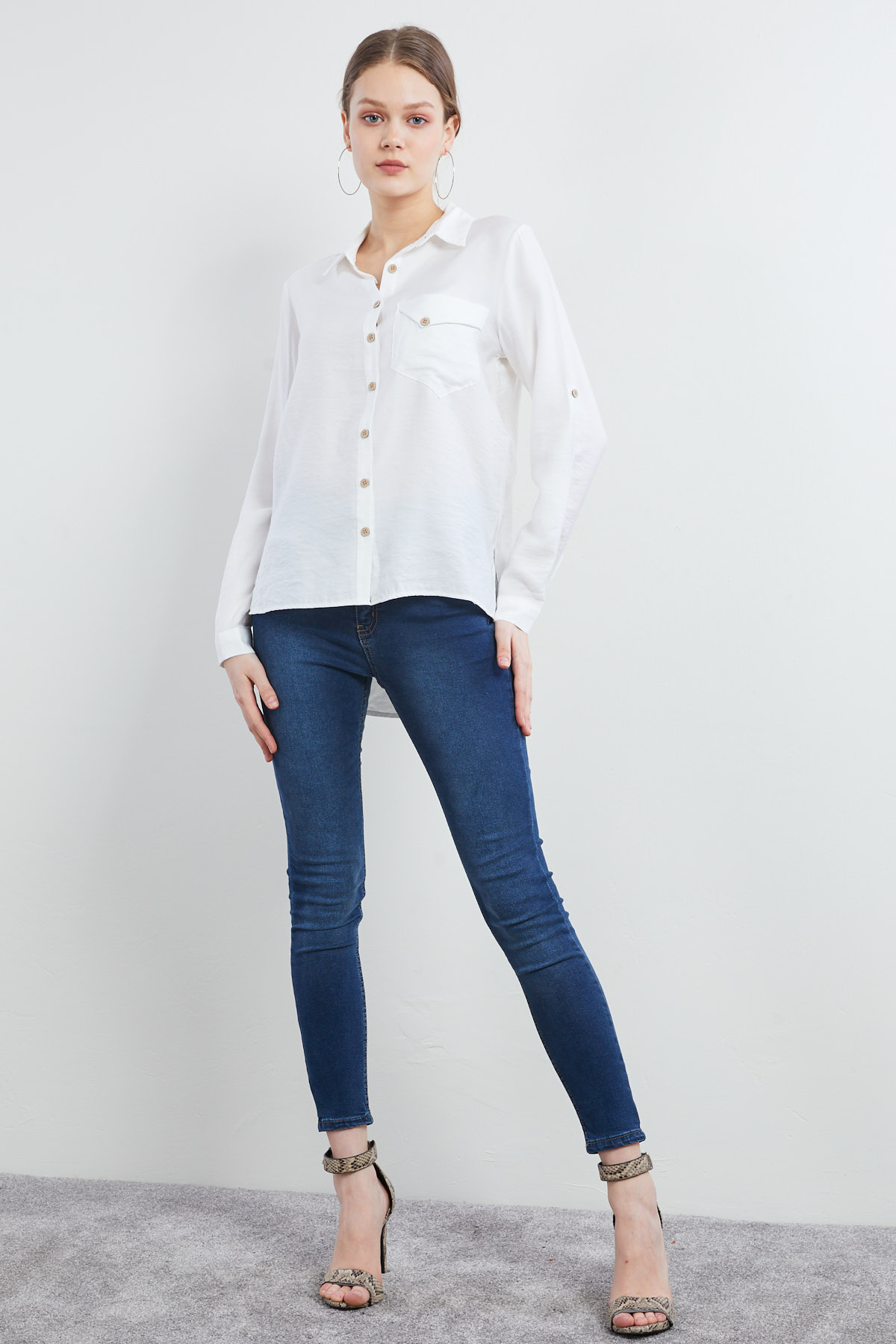 Ürün Özellikleri: Klasik yaka, tahta düğmeli, cep detaylı, tam kalıp, uzun kollu gömlek.