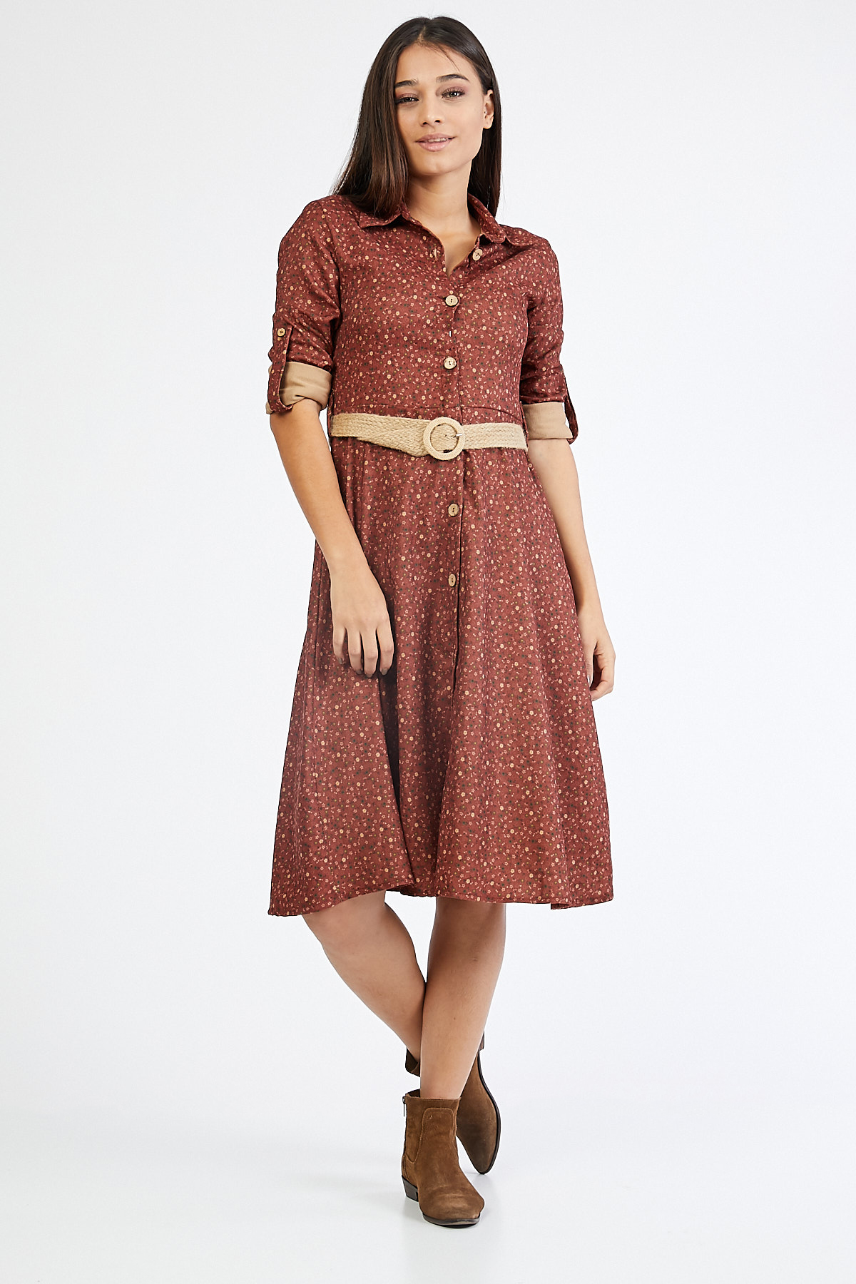 Çiçek Desenli Hasır Kemerli Bordo Elbise