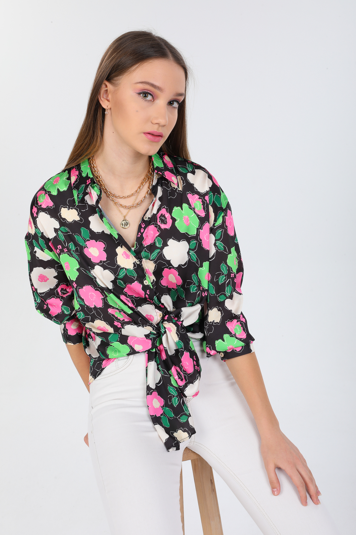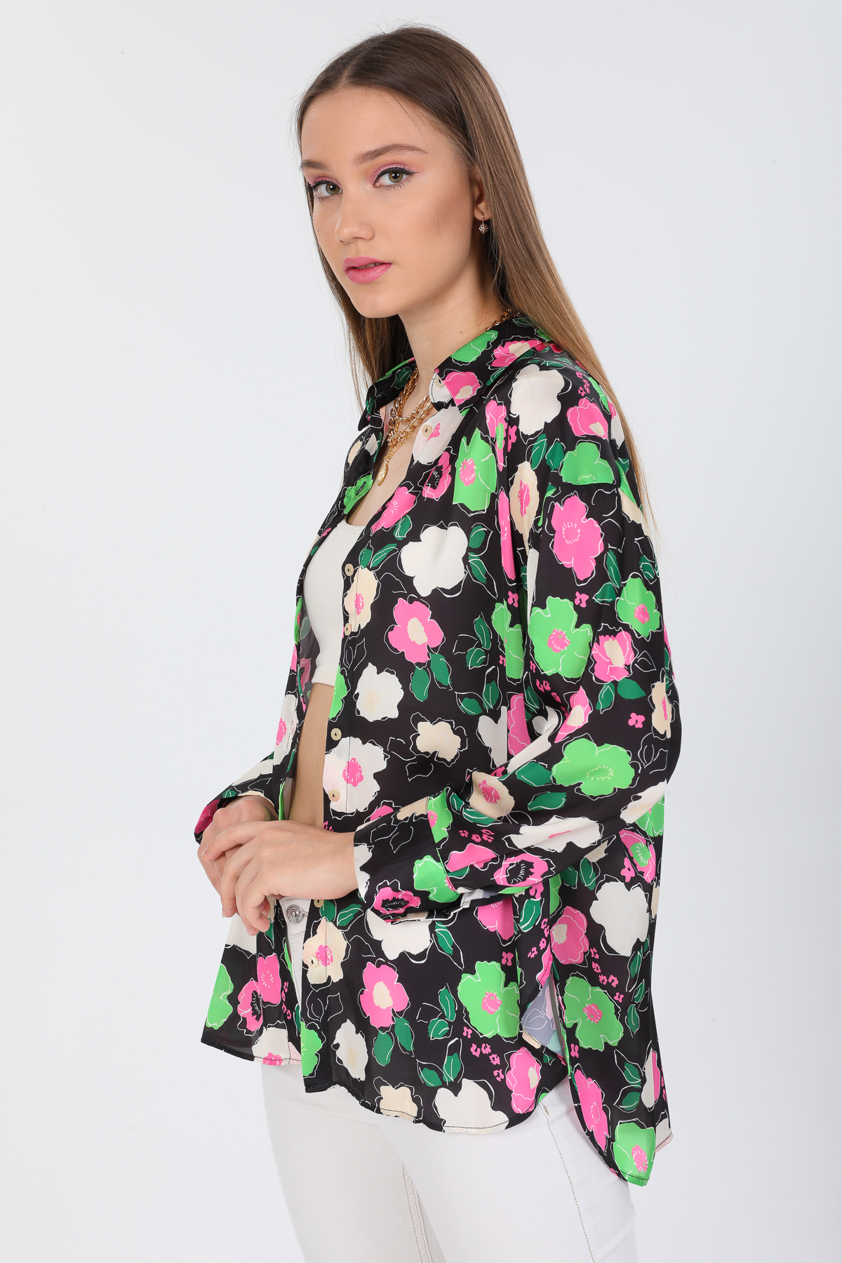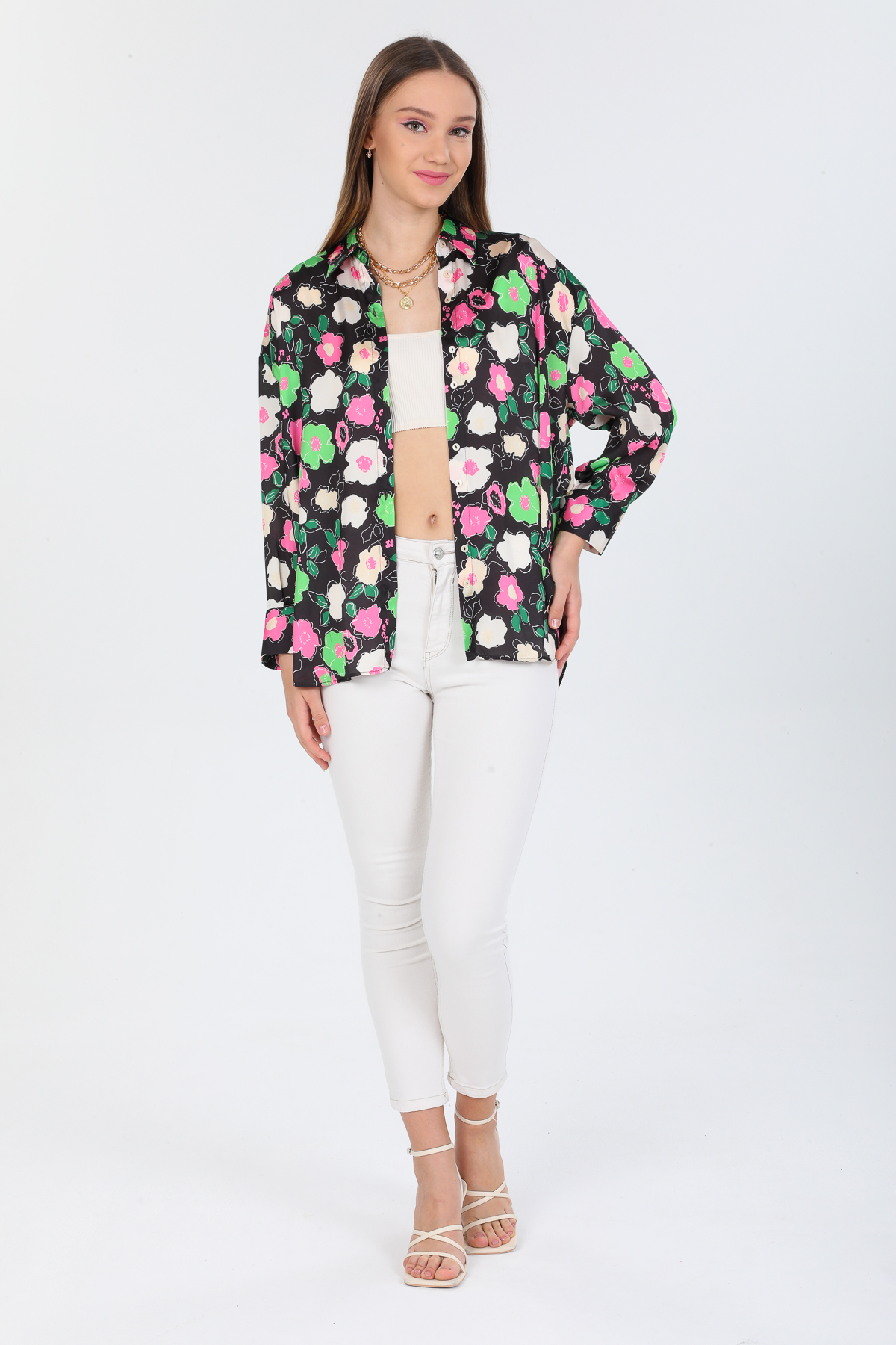 Çiçek Desenli Saten Oversize Gömlek