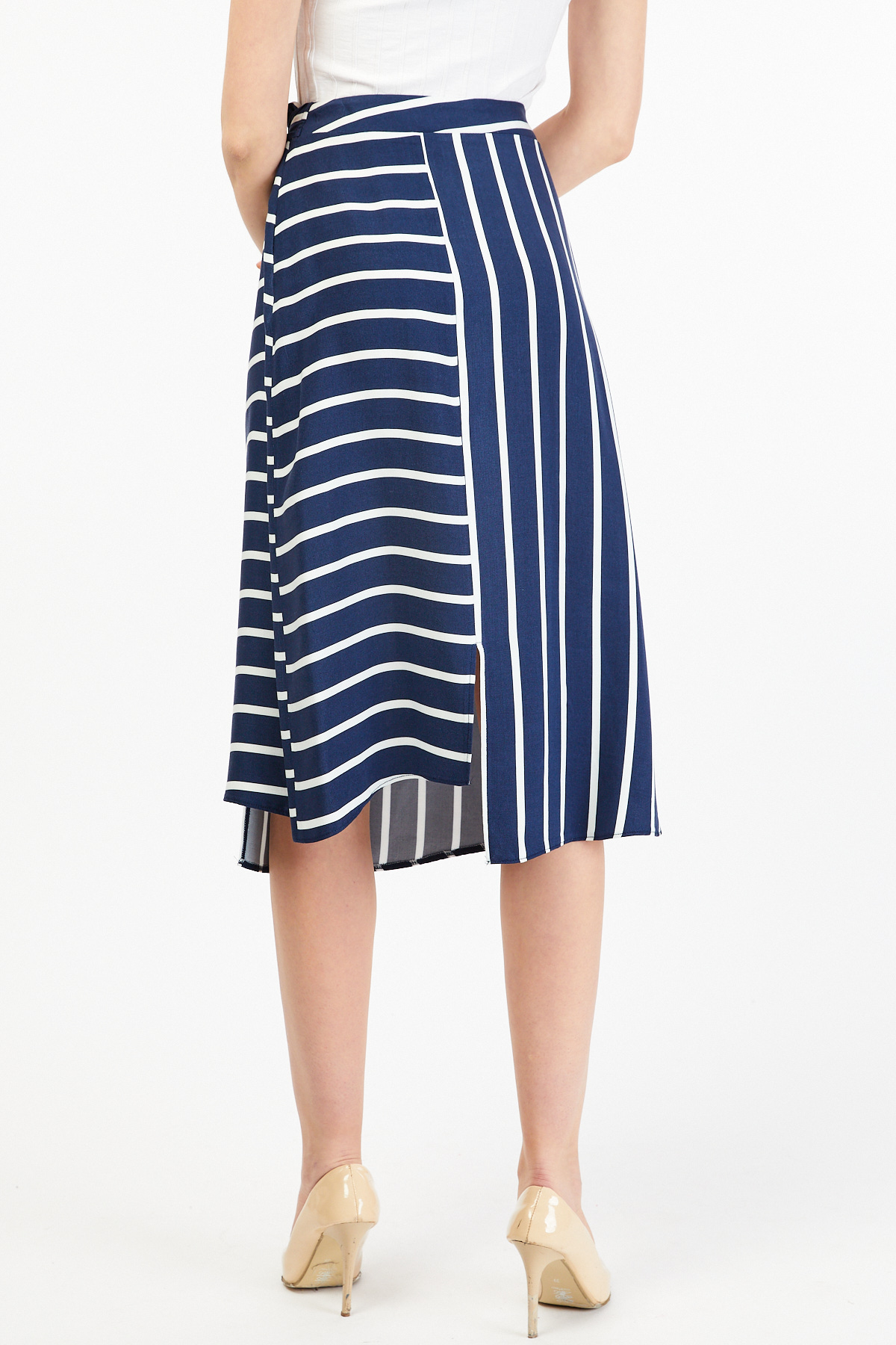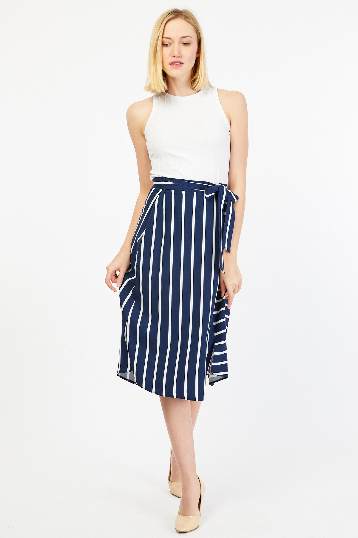 Ürün Özellikleri: Bağlama detaylı, a kesim, çizgili etek.