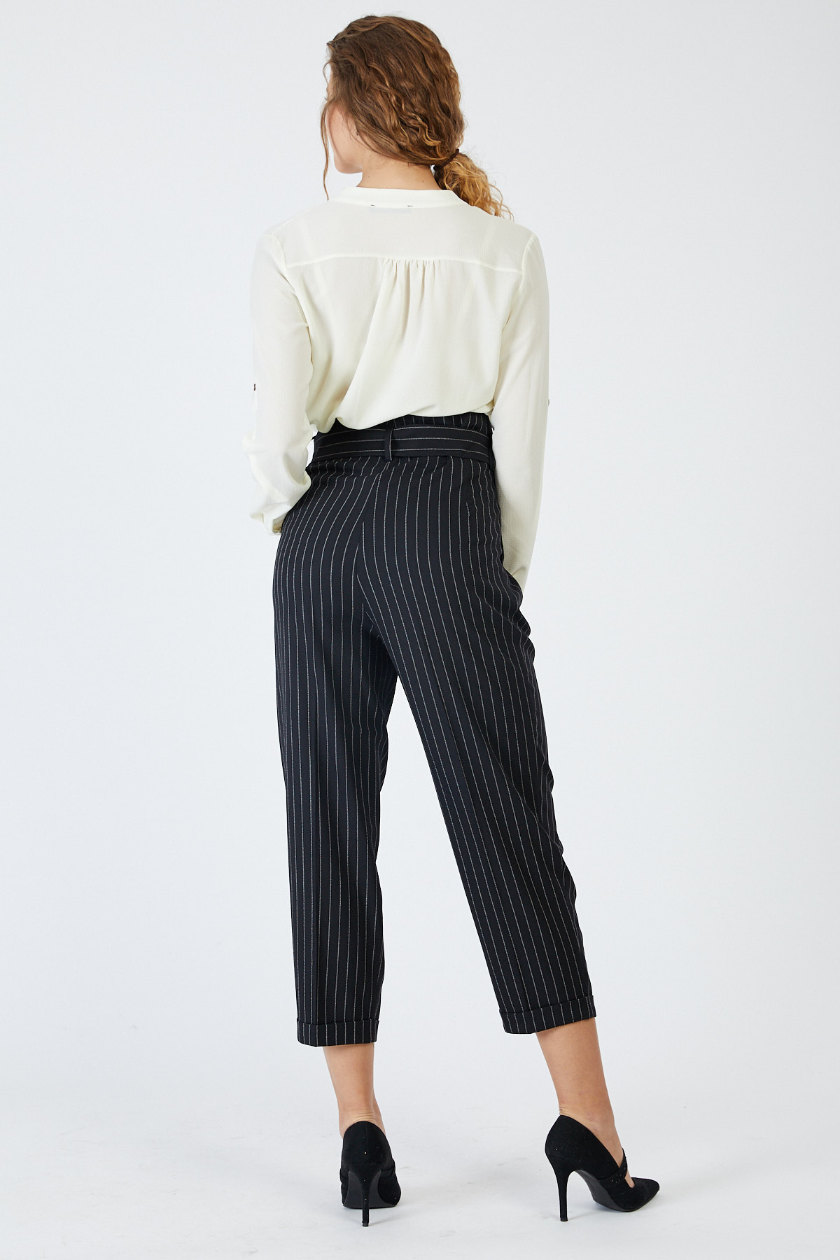 Ürün Özellikleri: Yüksek bel, kemer detaylı, ön cepli, kıvrılmış paça detaylı, havuç kesim, düğme-fermuarlı kapama pantolon.