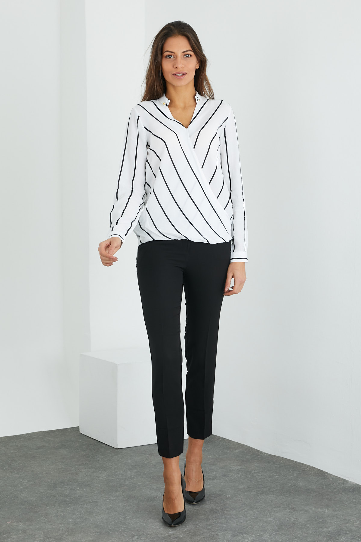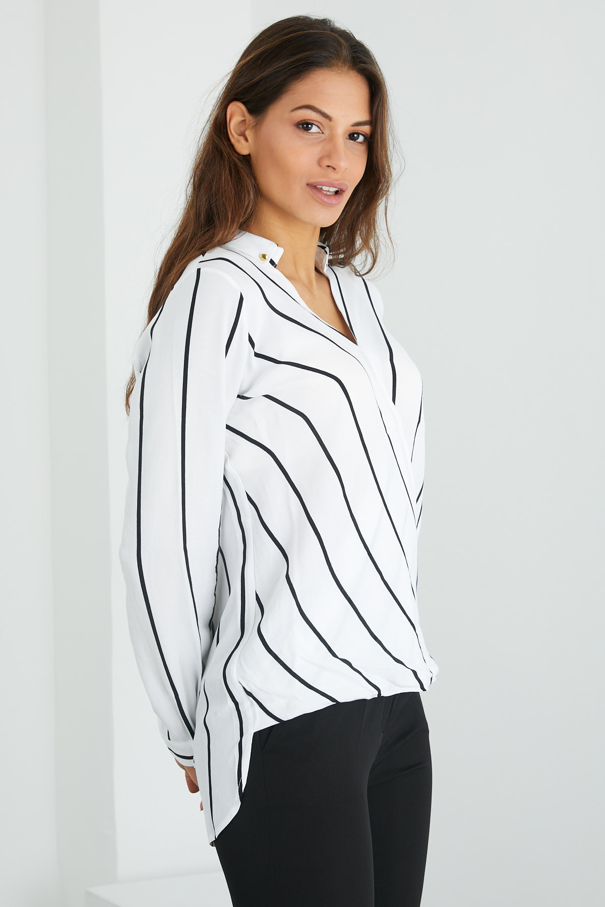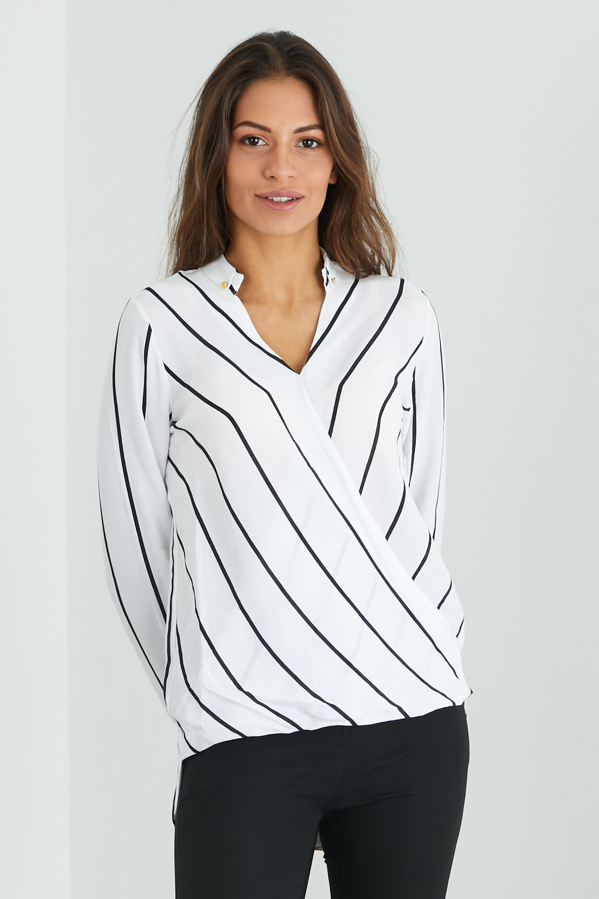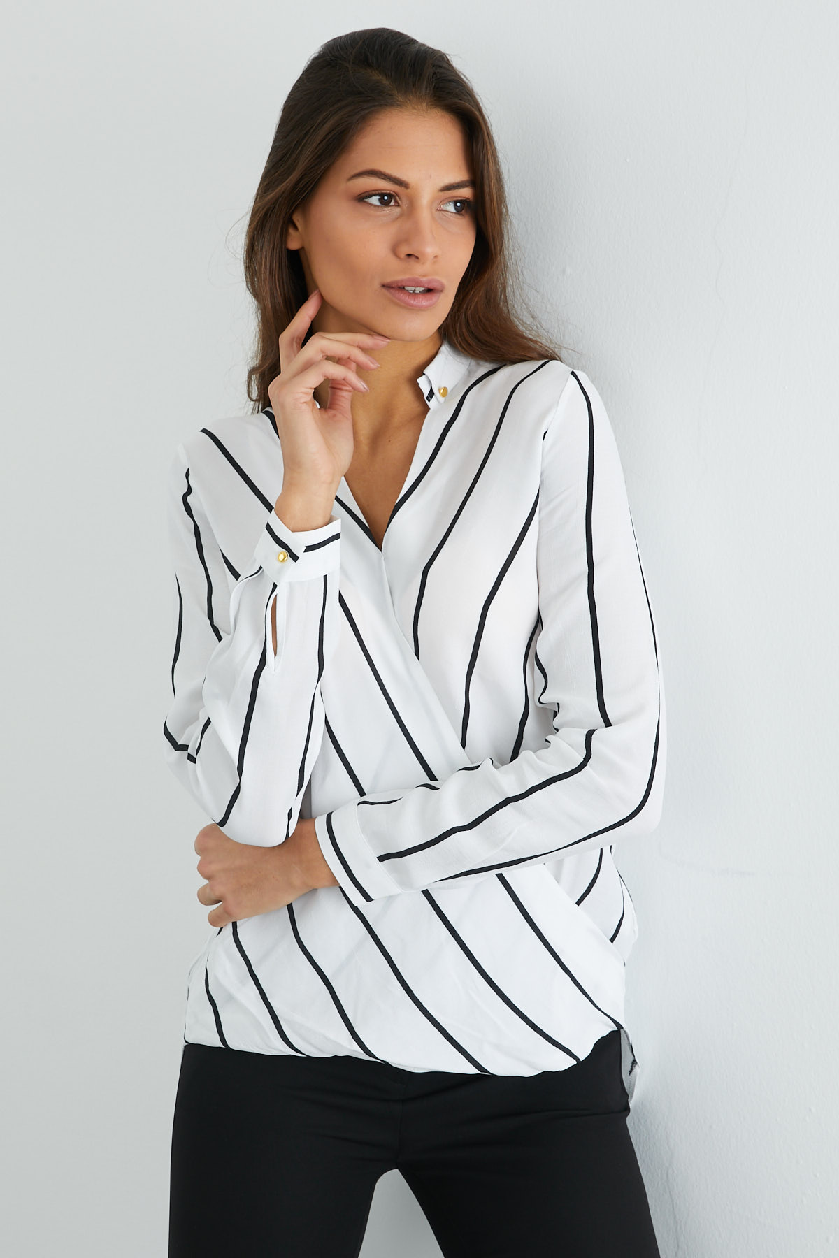 Çizgili Kruvaze Yaka Bluz
