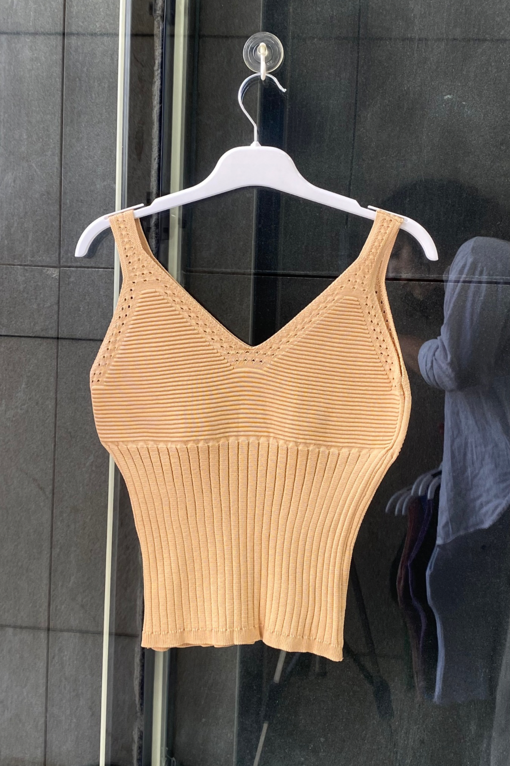 Crop V Yaka Yazlık Esnek Kumaş Triko Bluz