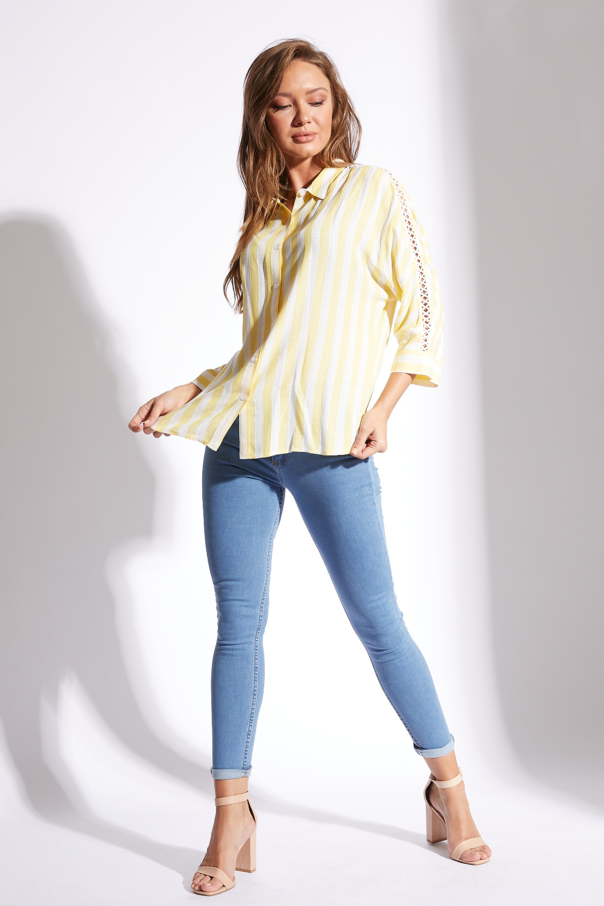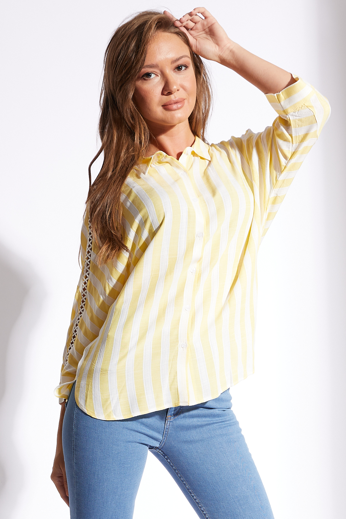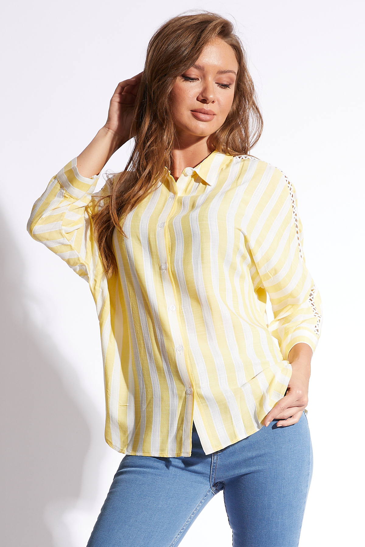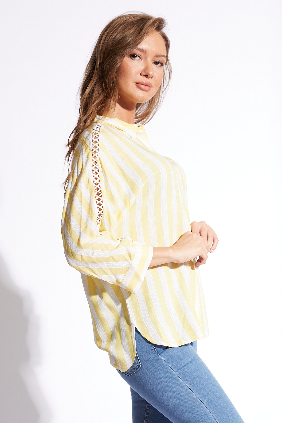 Ürün Özellikleri: Klasik yaka, kolları dantel detaylı, beyaz düğmeli, bol kalıp, fakir kol gömlek.