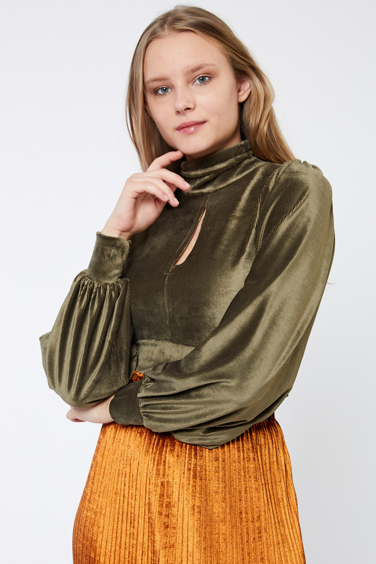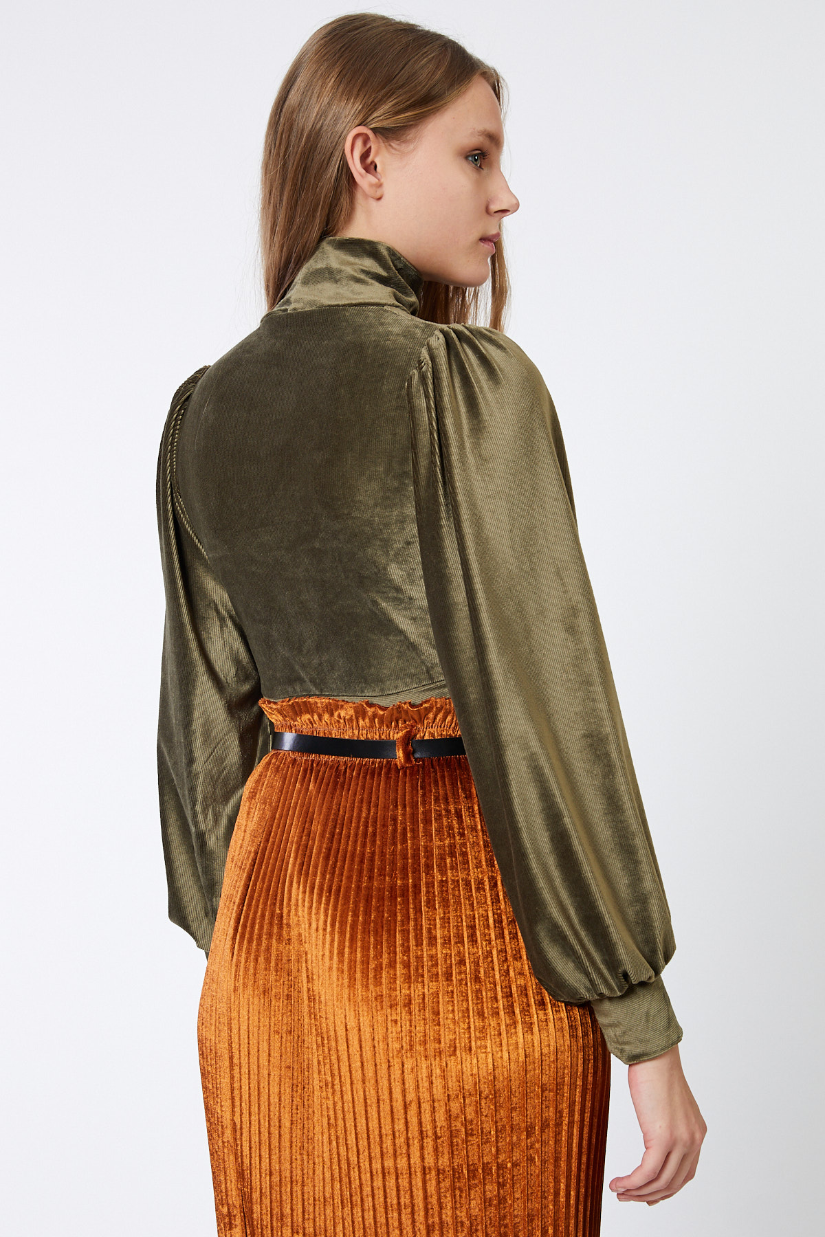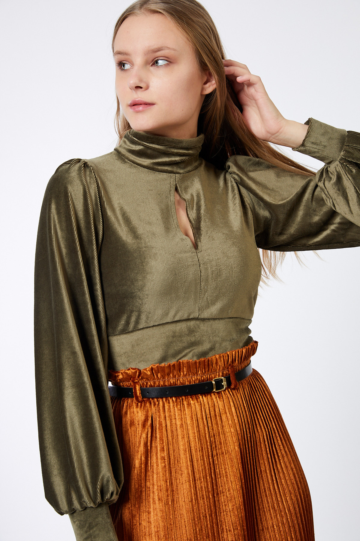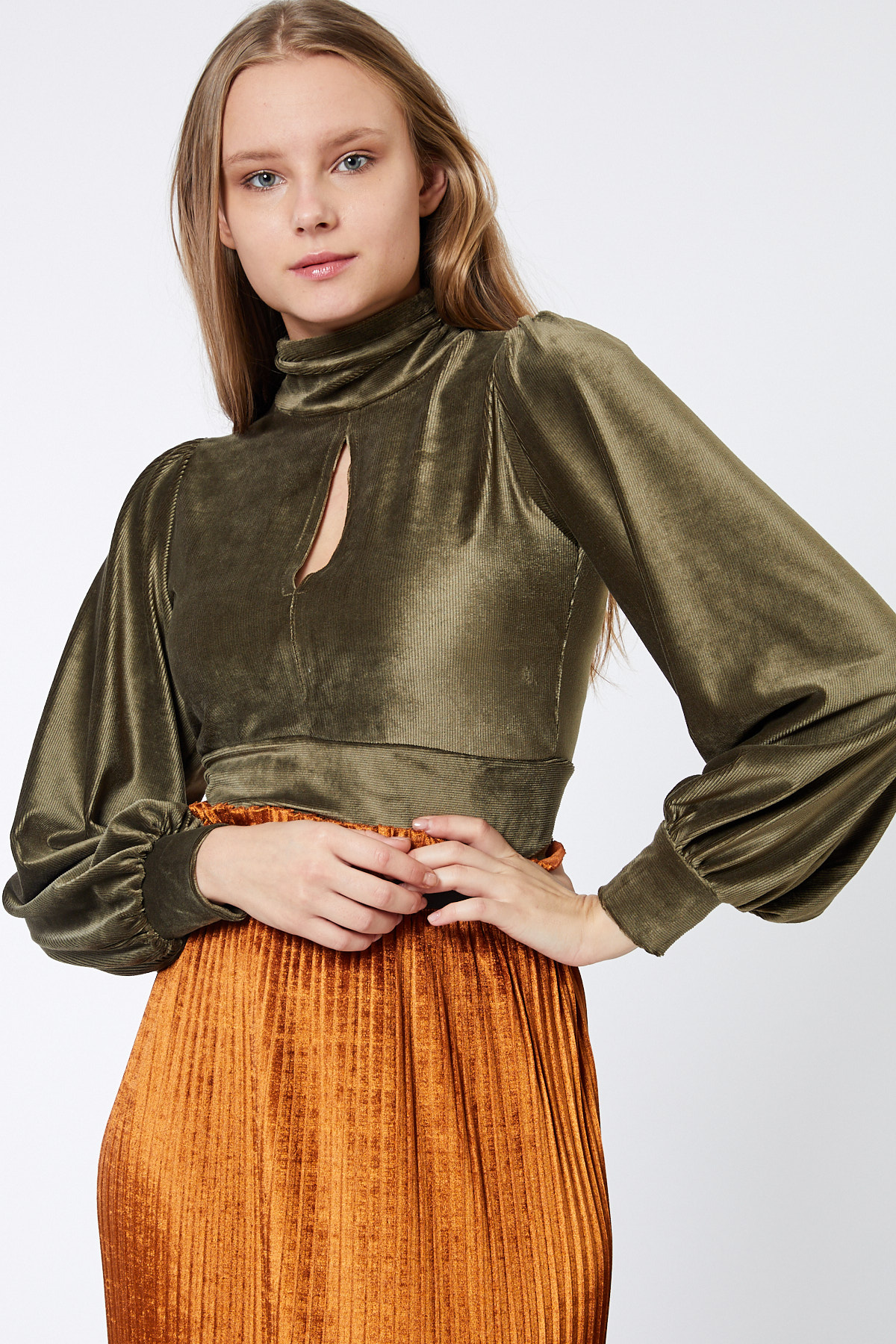 Ürün Özellikleri: Balıkçı yaka, karpuz kol, dekolte detaylı, crop model, kadife bluz.
