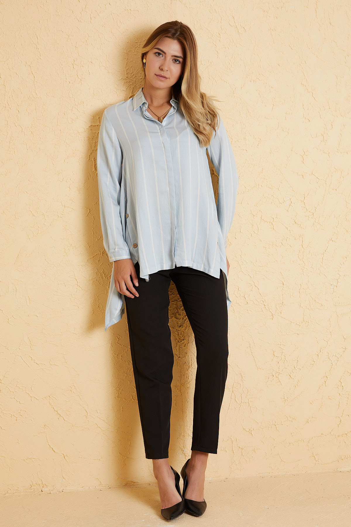 Ürün Özellikleri: Klasik yaka, gizli düğme iliklemeli, yanları yırtmaçlı düğme detaylı, önü kısa arkası uzun tunik elbise.