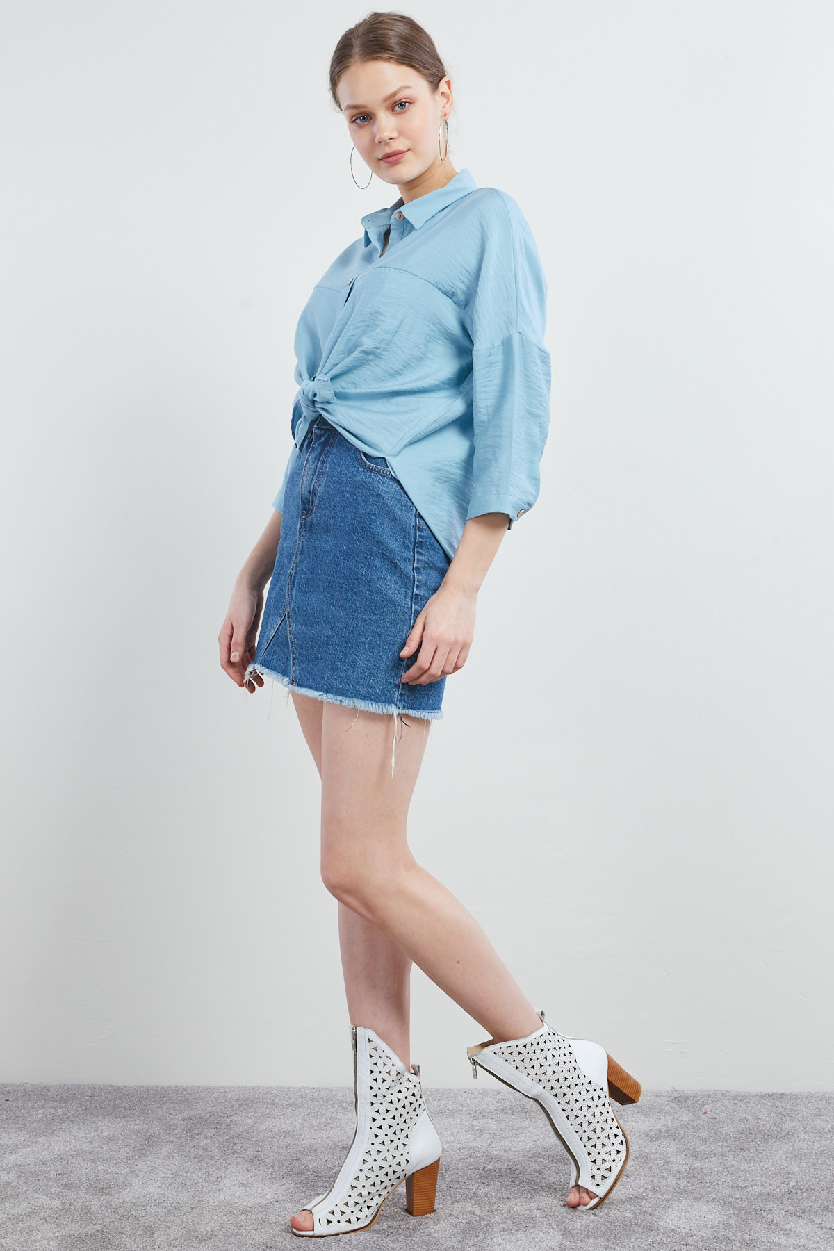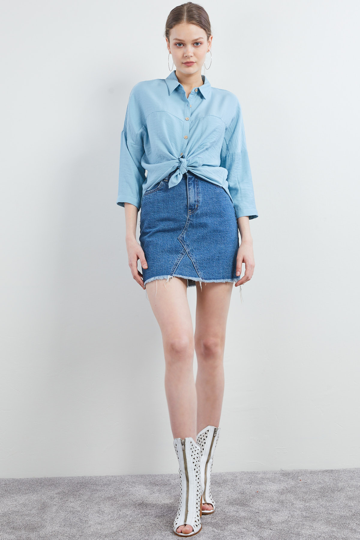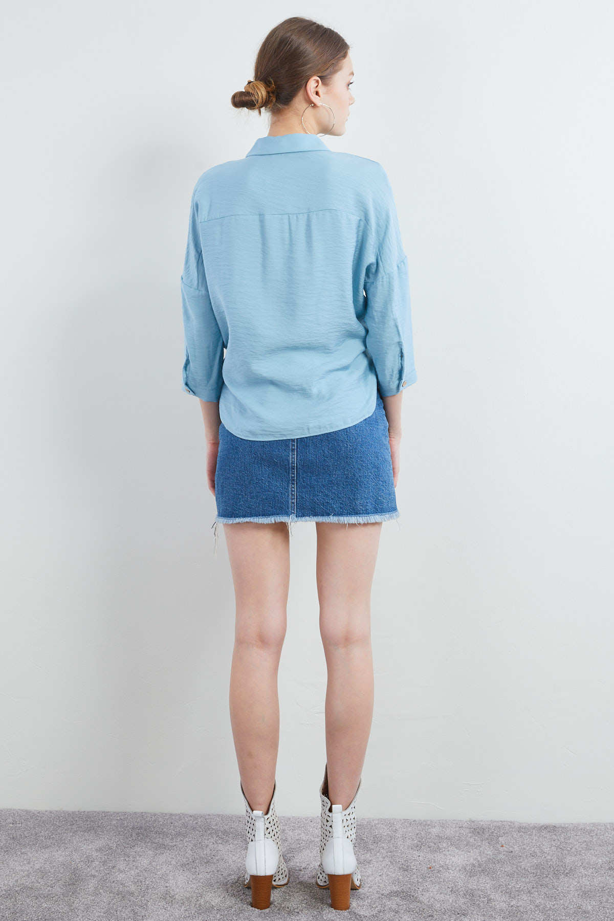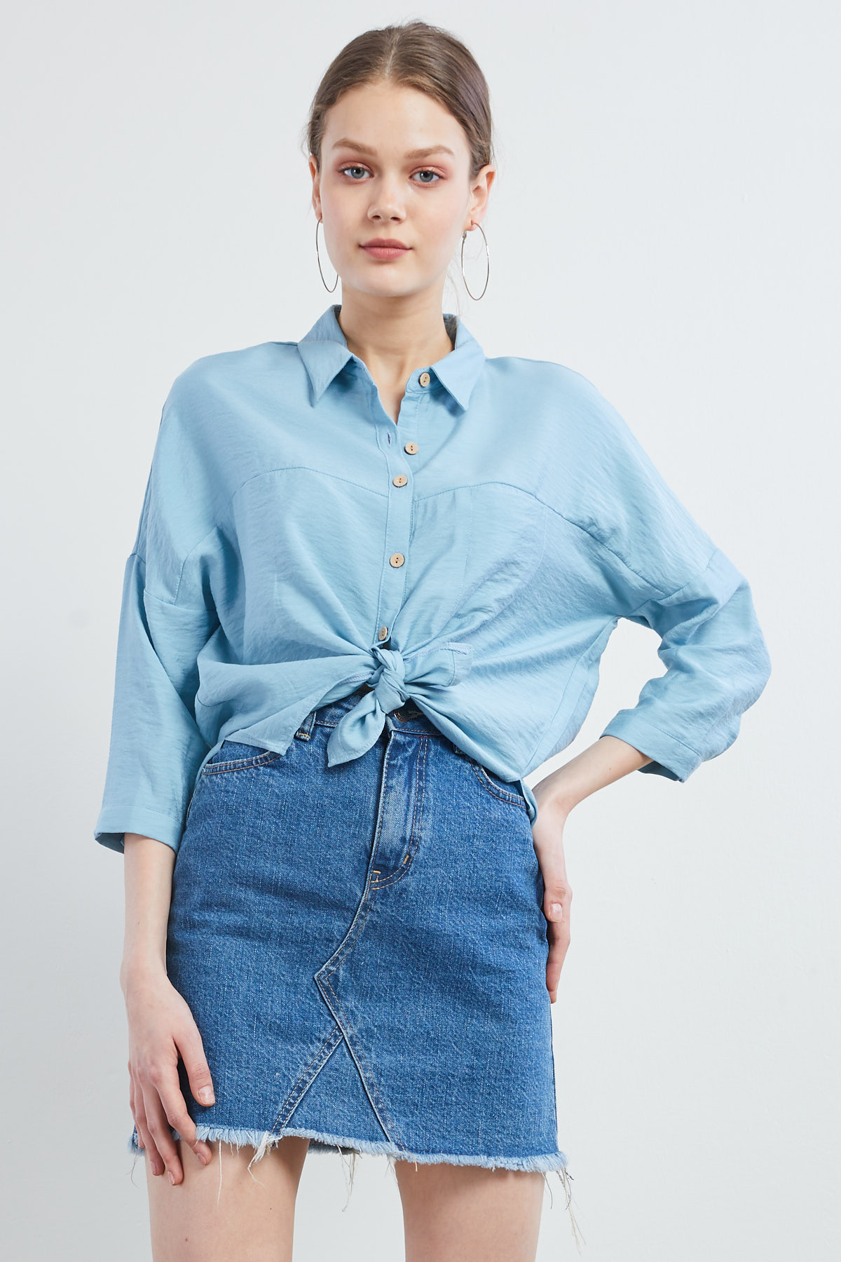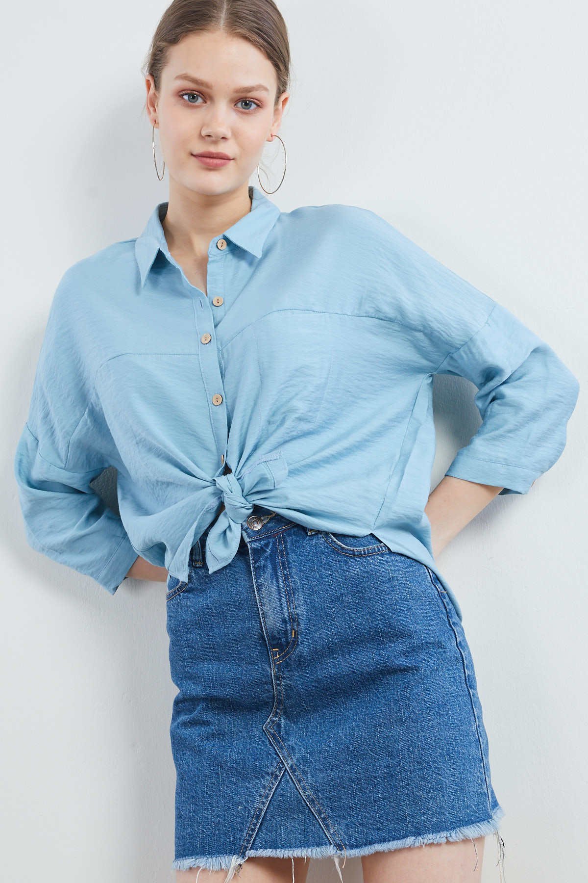 Ürün Özellikleri: Klasik yaka, tahta düğmeli, bol kalıp, yanları yırtmaç detaylı, yarasa kol gömlek.