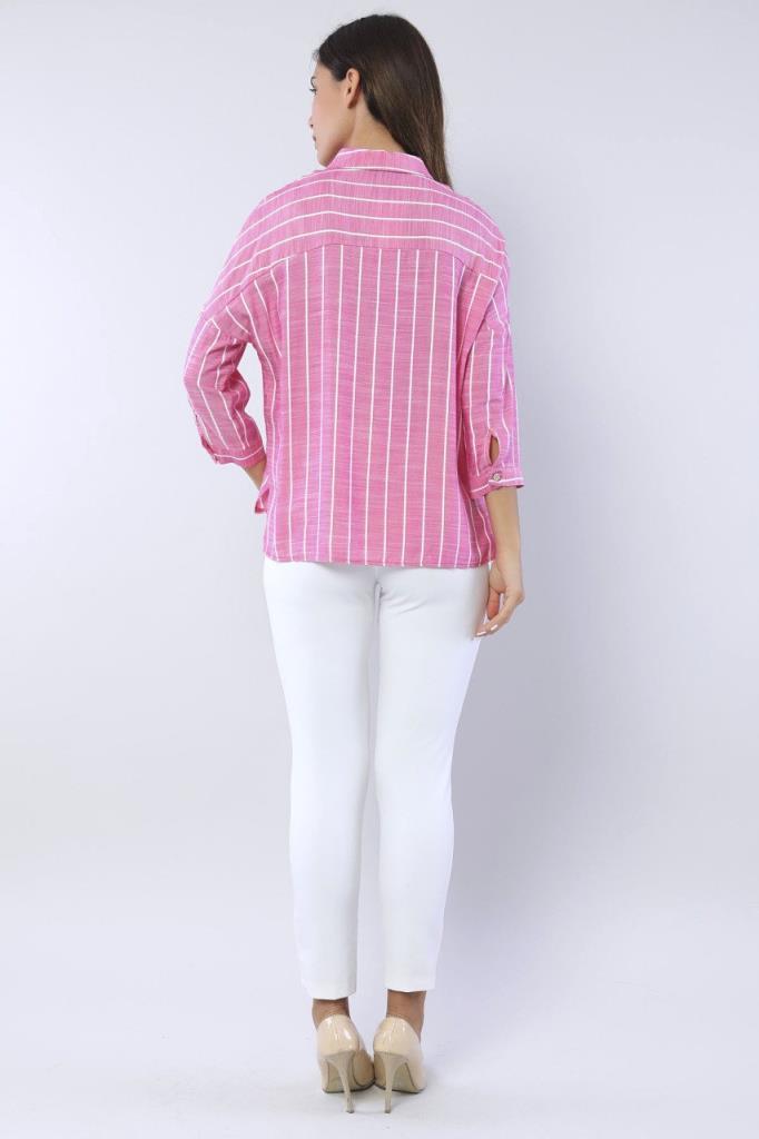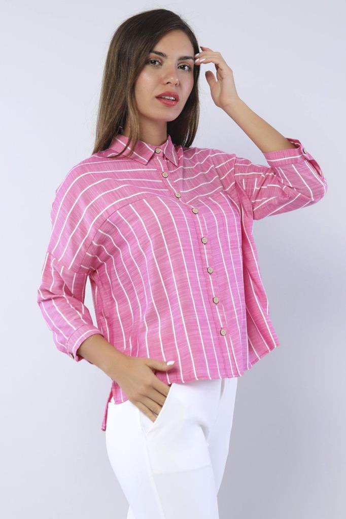 Ürün Özellikleri: Klasik yaka, tahta düğmeli, bol kalıp, yanları yırtmaç detaylı, yarasa kol gömlek.