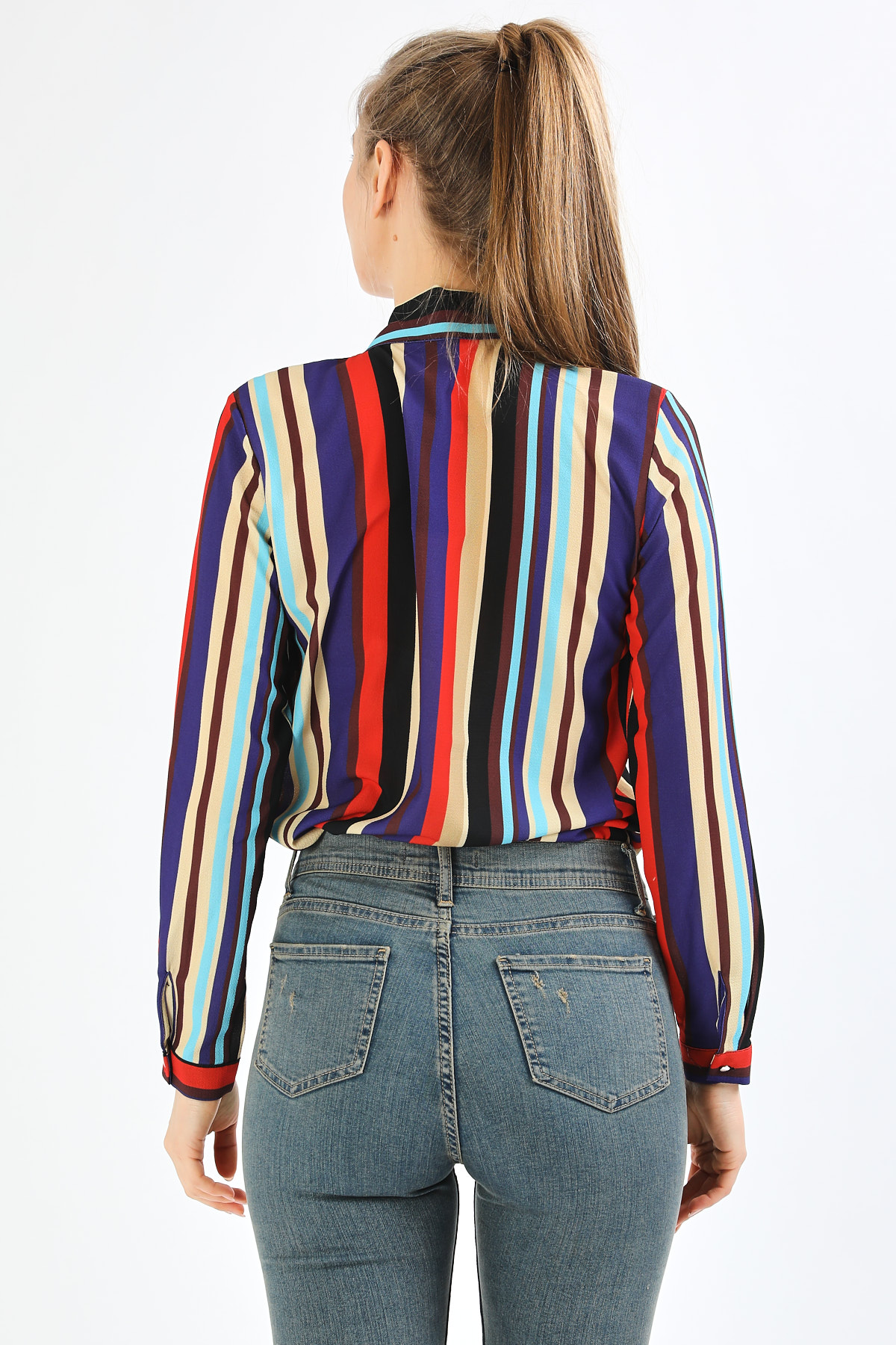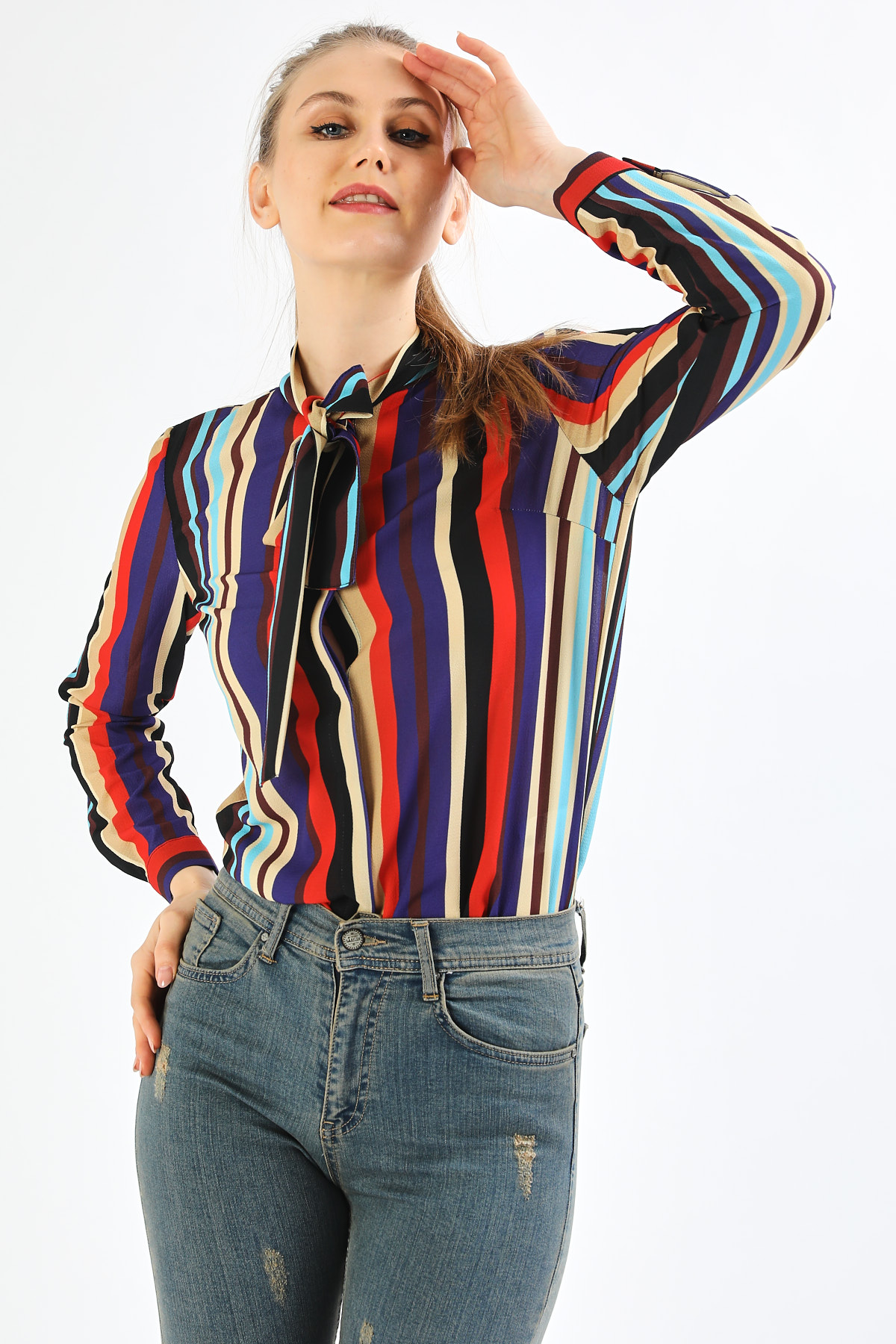 Ürün Özellikleri: Yakası fular detaylı, gizli düğme iliklemeli, tam kalıp, uzun kollu gömlek.