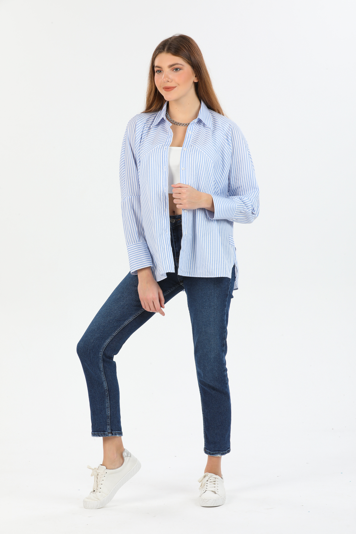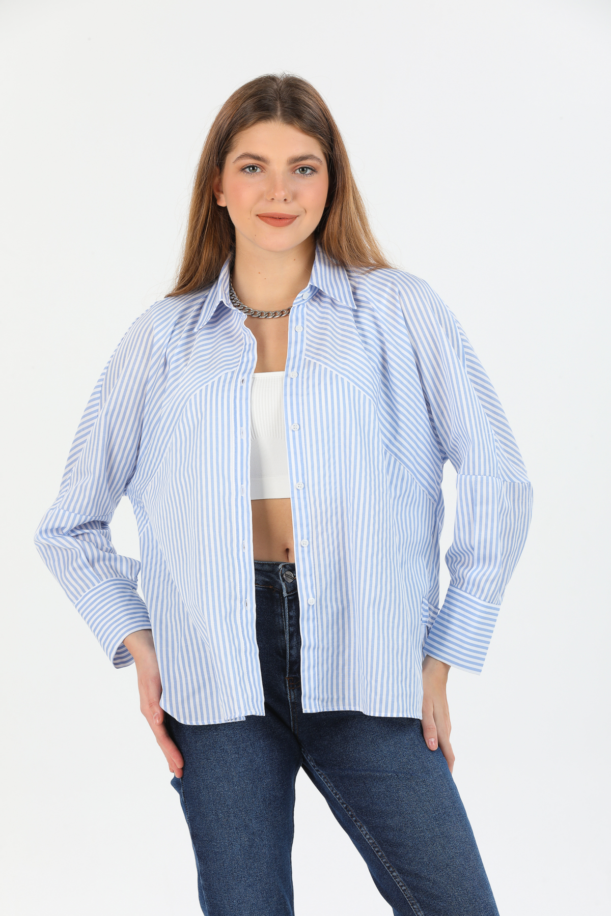 Kadın Asimetrik Çizgili Oversize Gömlek
