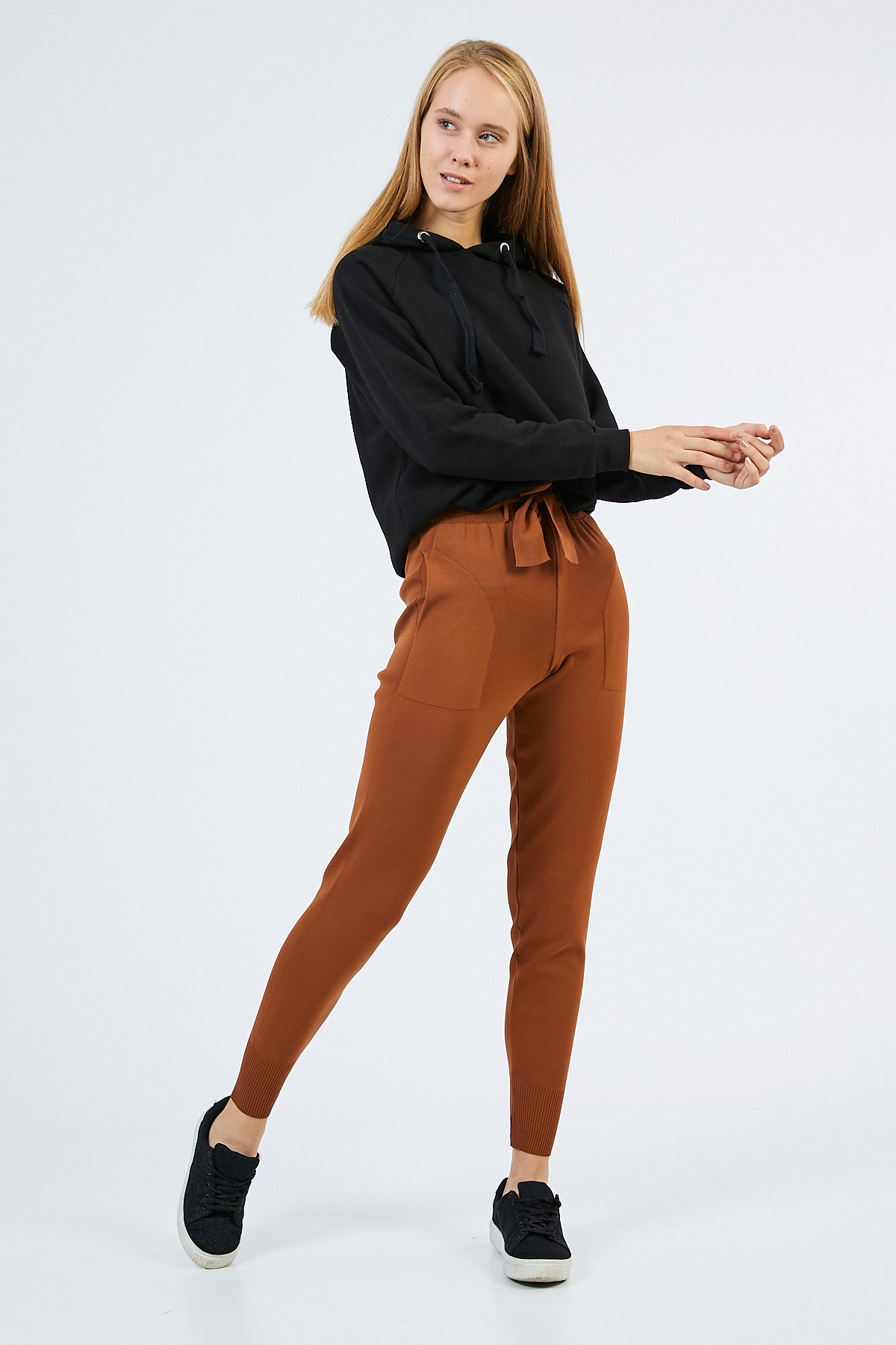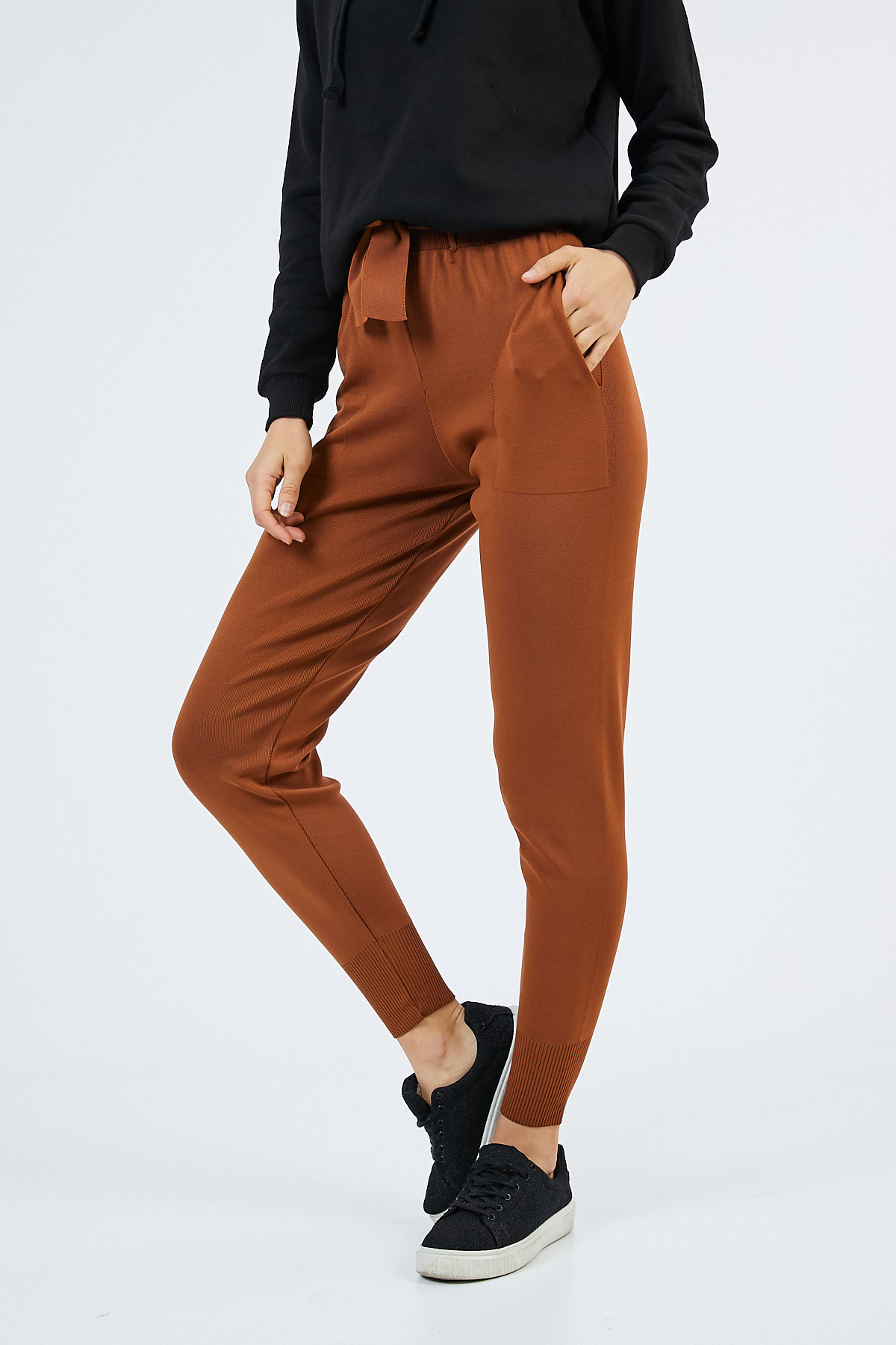 Ürün Özellikleri: Yüksek bel, ön cepli, dar paça, kuşaklı, bilekte triko pantolon.