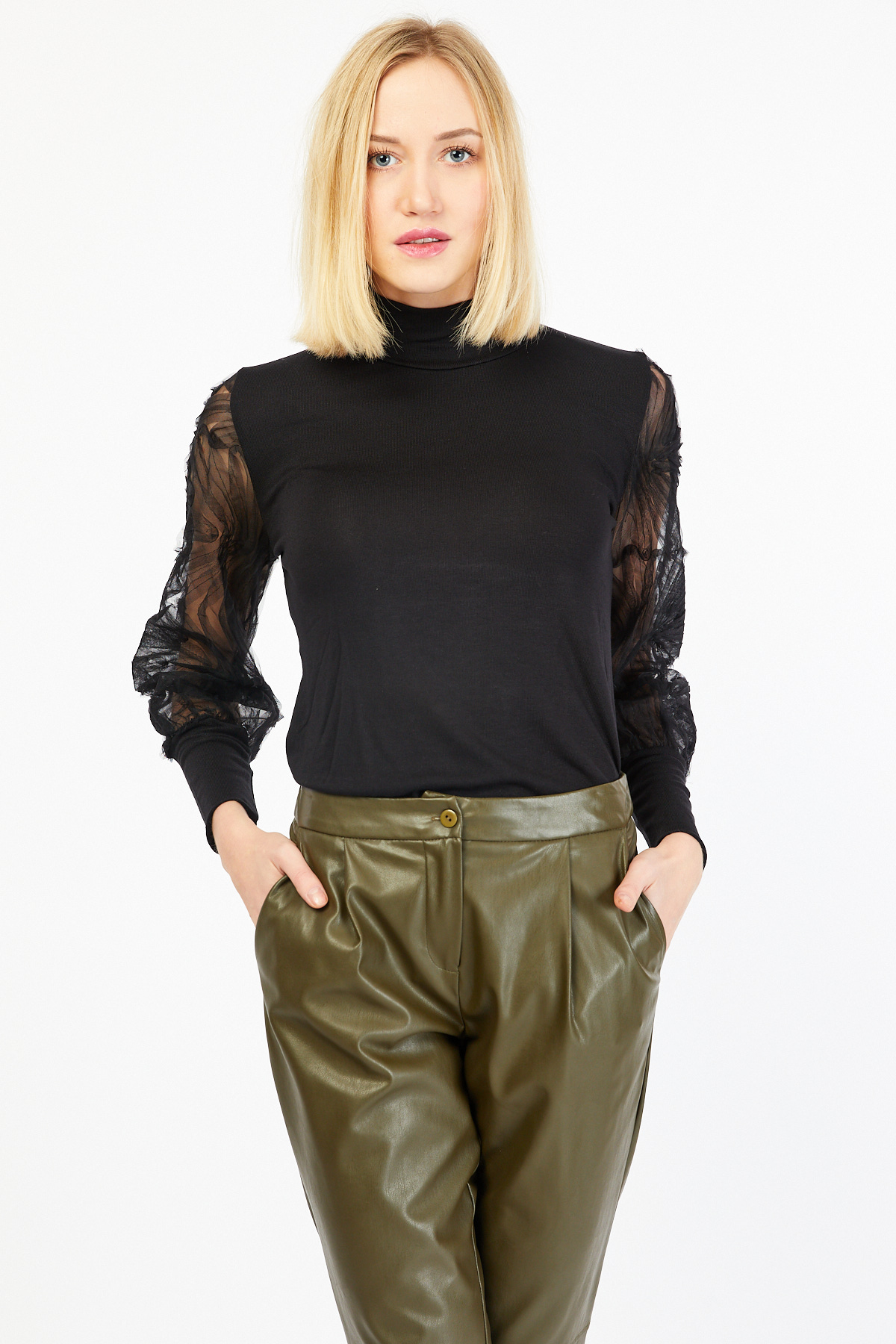 Ürün Özellikleri:Tam kalıp, yarım balıkçı yaka, kolları tül detaylı bluz.