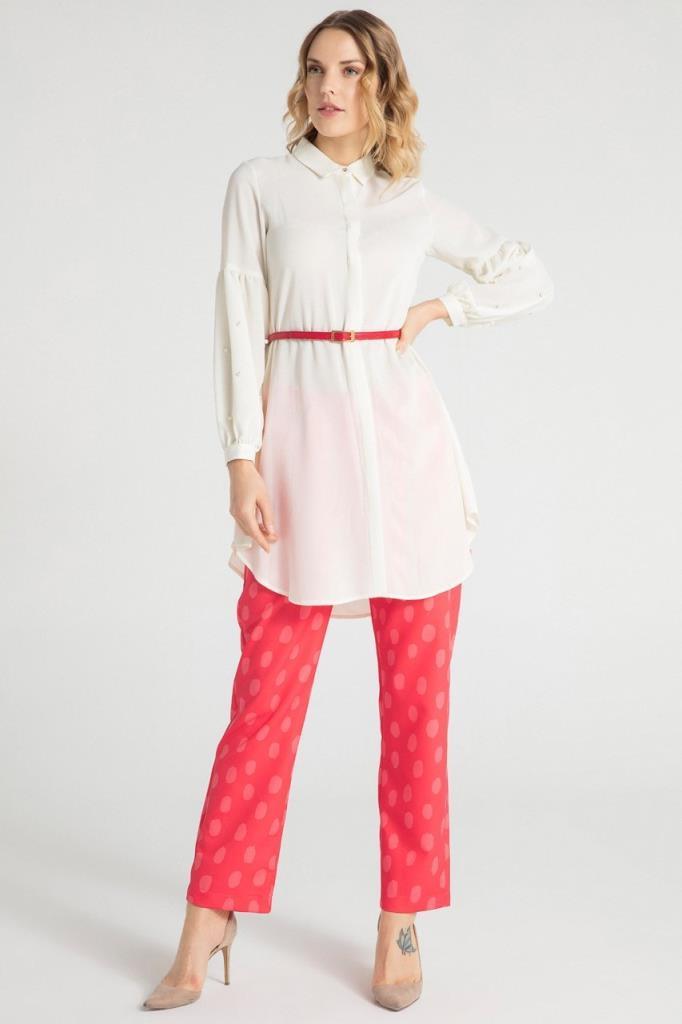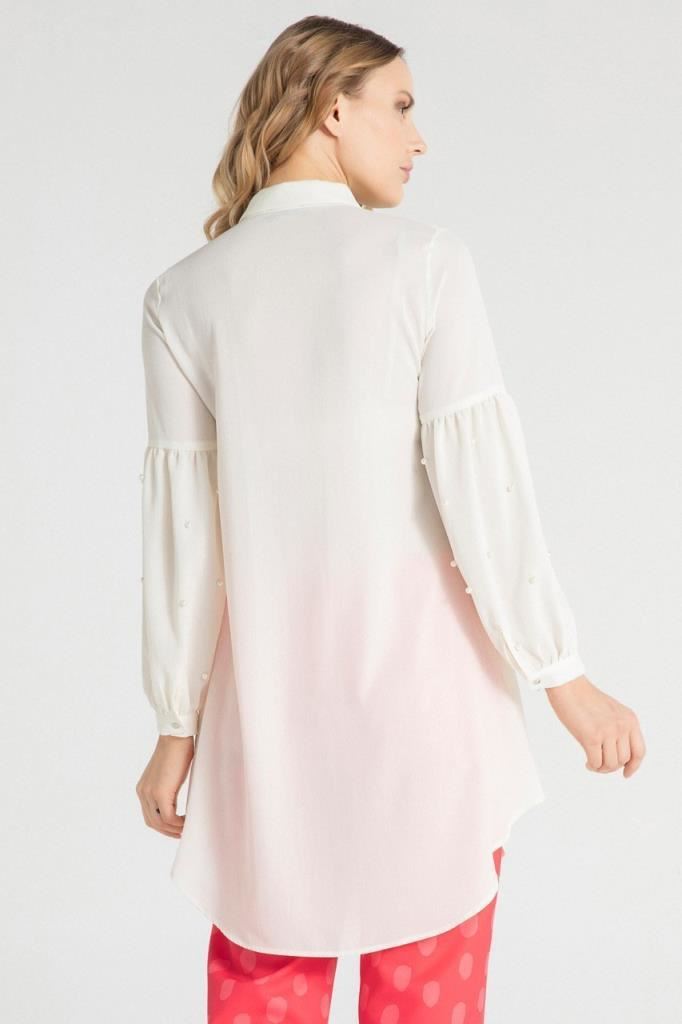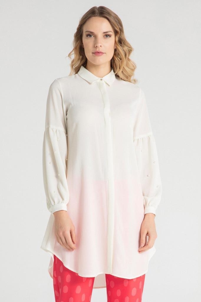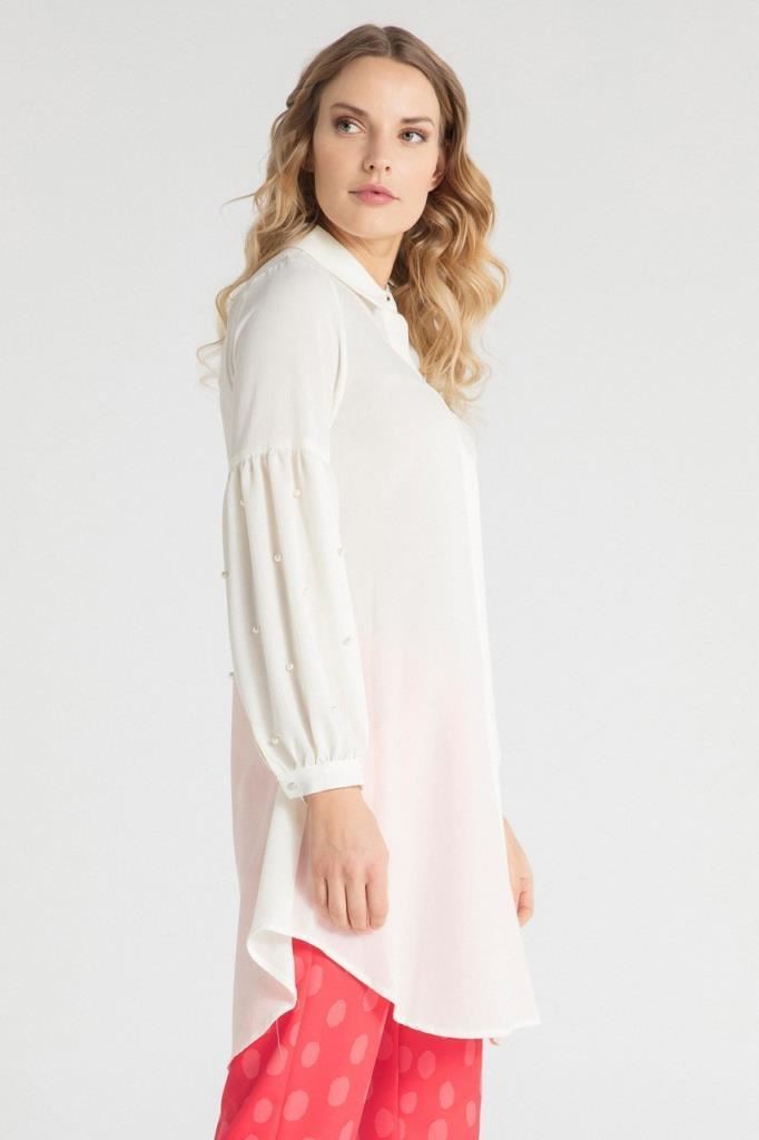 Ürün Özellikleri: Klasik yaka, gizli düğme iliklemeli, kolları inci detaylı, çan model, balon kol tunik elbise.