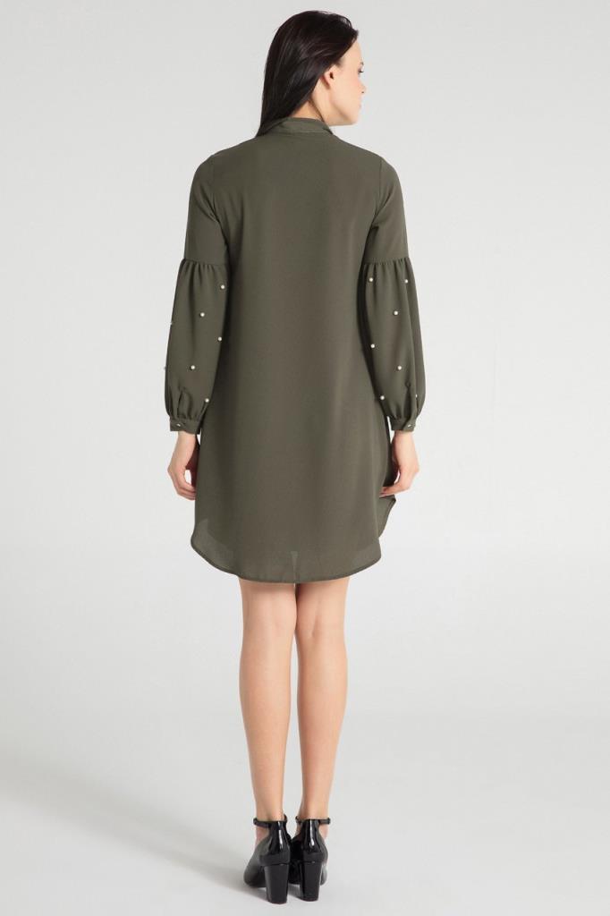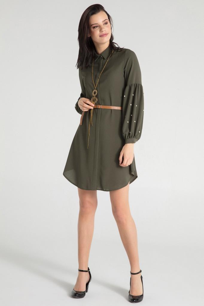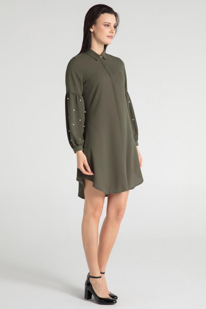 Ürün Özellikleri: Klasik yaka, gizli düğme iliklemeli, kolları inci detaylı, çan model, balon kol tunik elbise.