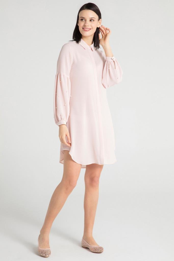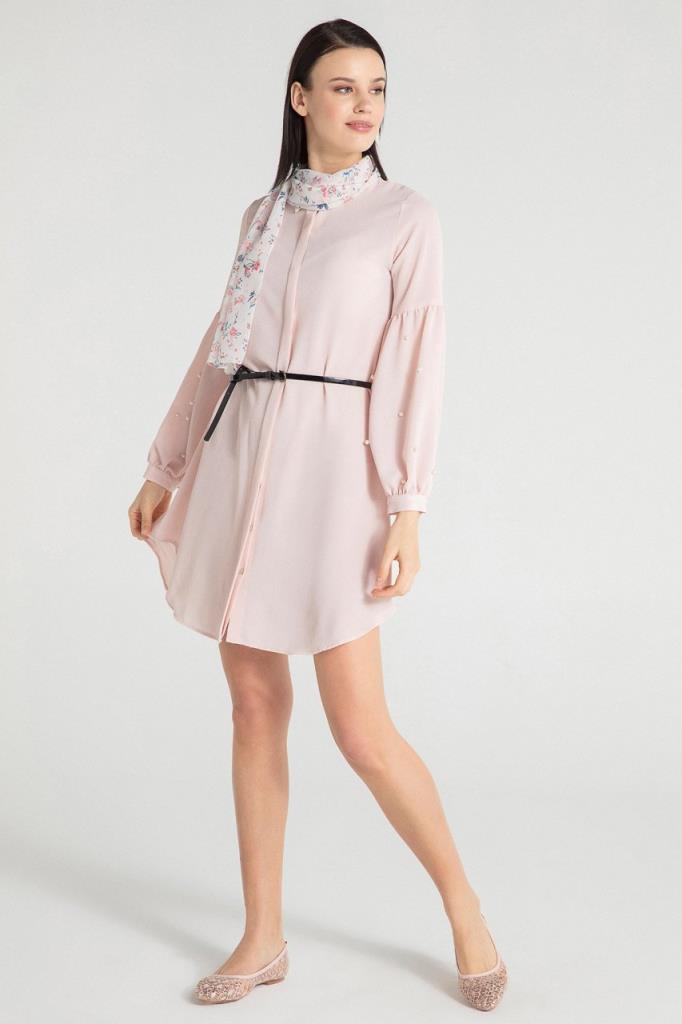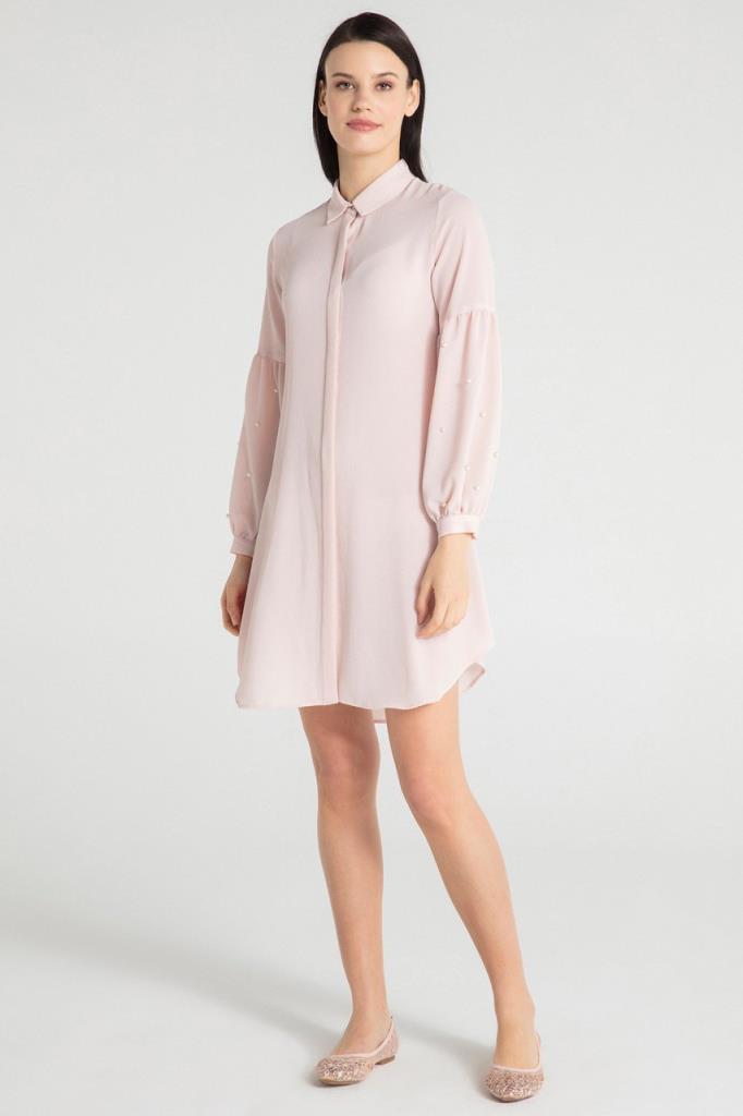 Ürün Özellikleri: Klasik yaka, gizli düğme iliklemeli, kolları inci detaylı, çan model, balon kol tunik elbise.